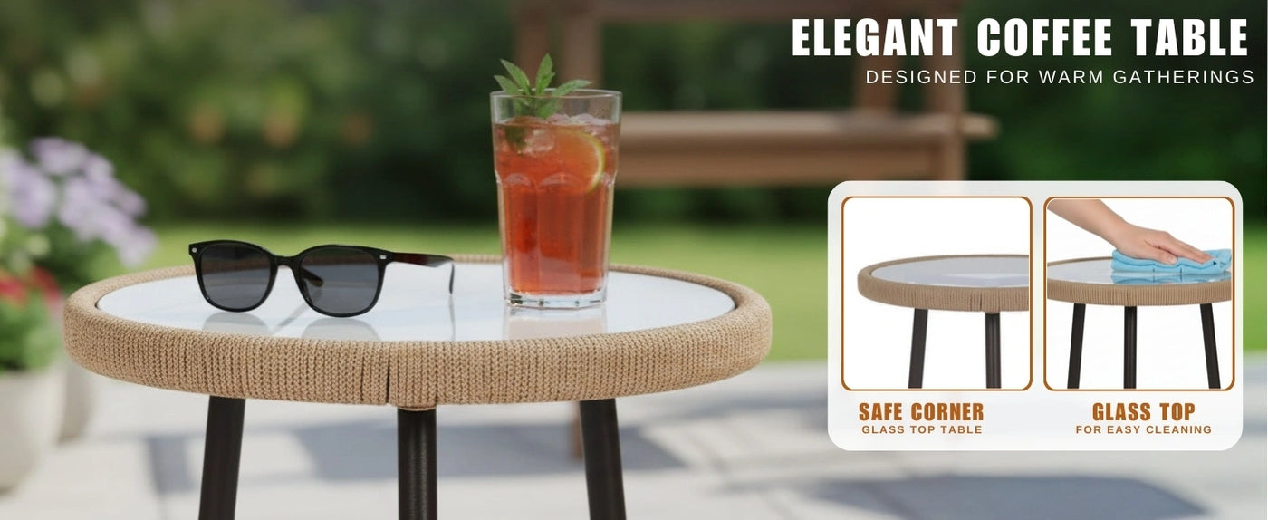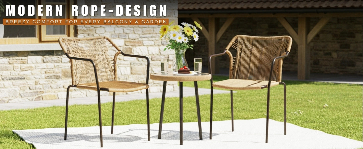 Transform your outdoor spaces with this elegant 3-piece rope patio chair set, thoughtfully designed to bring both comfort and style to your garden, deck, lawn, poolside, or balcony. The set includes two ergonomically designed rope-woven chairs and a glass top side table, creating the perfect setup for relaxation, conversation, or enjoying your favorite drink outdoors. Crafted with a powder-coated metal frame, the chairs and table are built to withstand varying weather conditions while ensuring long-lasting durability. The seats feature handwoven, all-weather rope that provides a breathable, flexible, and supportive seating experience, while adding a modern, textured look. The table is topped with a glass surface, providing a stable and scratch-resistant area for drinks, snacks, or décor items. Compact yet stylish, this set is versatile enough to enhance any outdoor setting, from large gardens to small balconies. Its lightweight design makes it easy to move, while its sturdy construction ensures stability.