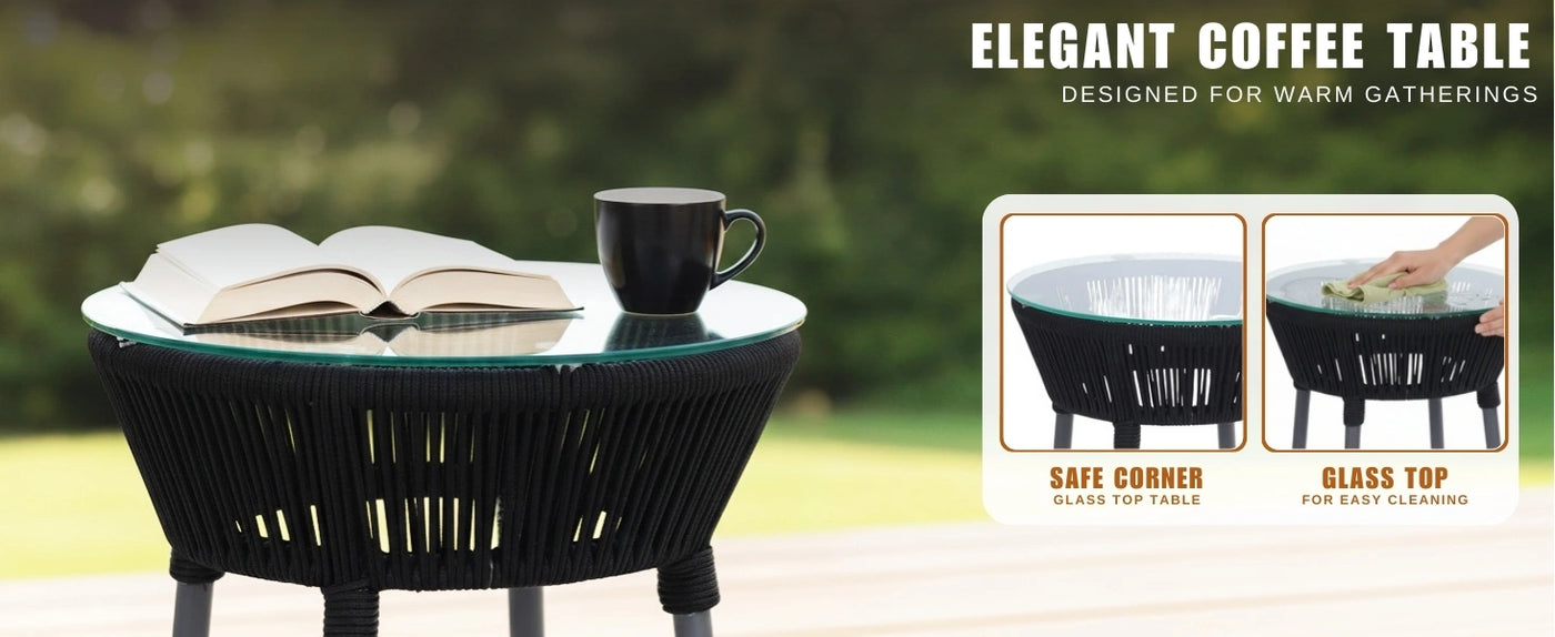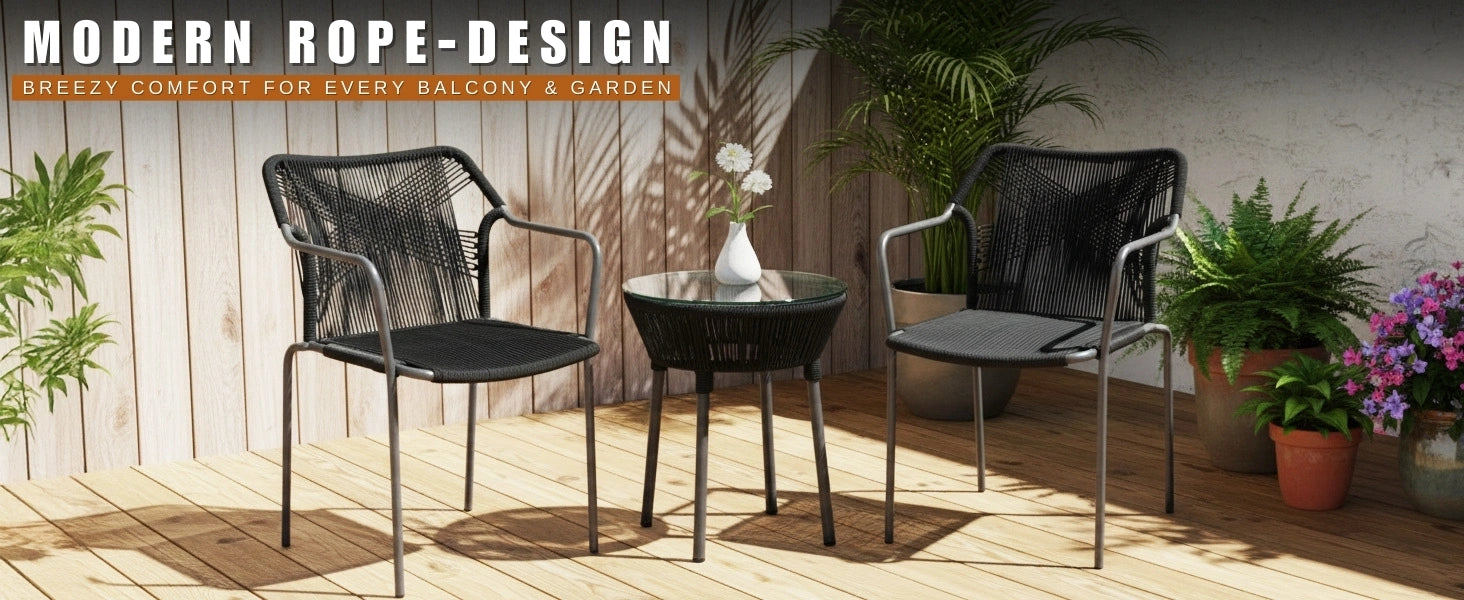 Transform your outdoor spaces with this elegant 3-piece rope patio chair set, thoughtfully designed to bring both comfort and style to your garden, deck, lawn, poolside, or balcony. The set includes two ergonomically designed rope-woven chairs and a glass top side table, creating the perfect setup for relaxation, conversation, or enjoying your favorite drink outdoors. Crafted with a powder-coated metal frame, the chairs and table are built to withstand varying weather conditions while ensuring long-lasting durability. The seats feature handwoven, all-weather rope that provides a breathable, flexible, and supportive seating experience, while adding a modern, textured look. The table is topped with a glass surface, providing a stable and scratch-resistant area for drinks, snacks, or décor items. Compact yet stylish, this set is versatile enough to enhance any outdoor setting, from large gardens to small balconies. Its lightweight design makes it easy to move, while its sturdy construction ensures stability.