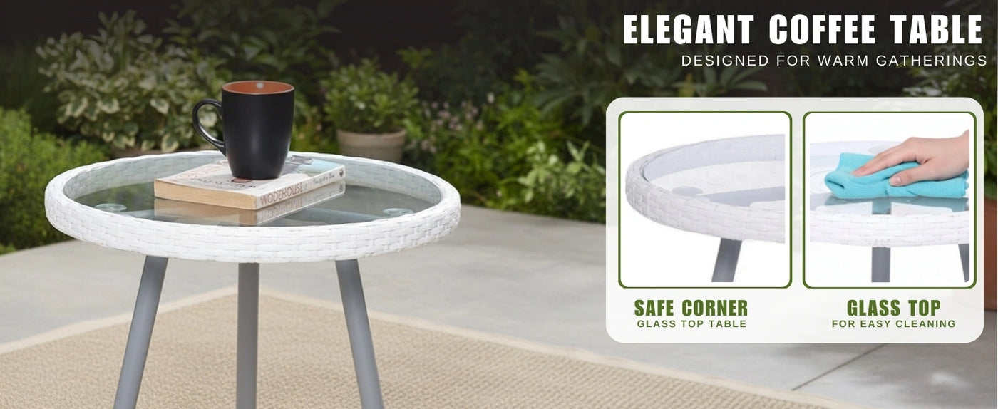Transform your outdoor spaces with this elegant 3-piece wicker patio chair set, thoughtfully designed to bring both comfort and style to your garden, deck, lawn, poolside, or balcony. The set includes two ergonomically designed wicker-woven chairs and a glass top side table, creating the perfect setup for relaxation, conversation, or enjoying your favorite drink outdoors. Crafted with a powder-coated metal frame, the chairs and table are built to withstand varying weather conditions while ensuring long-lasting durability. The seats feature handwoven, all-weather wicker that provides a breathable, flexible, and supportive seating experience, while adding a modern, textured look. The table is topped with a glass surface, providing a stable and scratch-resistant area for drinks, snacks, or décor items. Compact yet stylish, this set is versatile enough to enhance any outdoor setting, from large gardens to small balconies. Its lightweight design makes it easy to move, while its sturdy construction ensures stability.