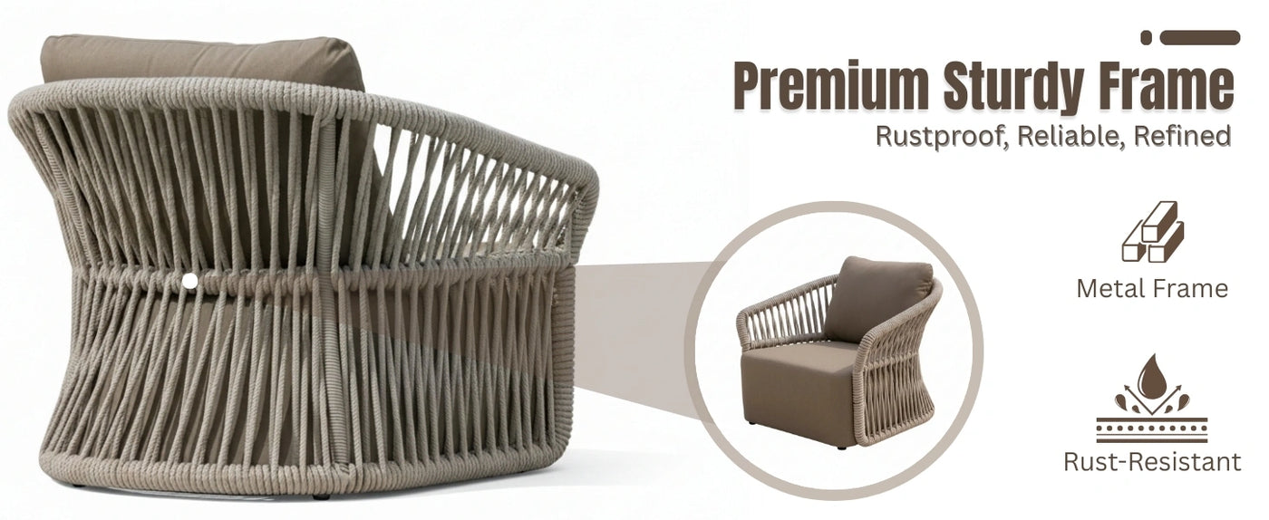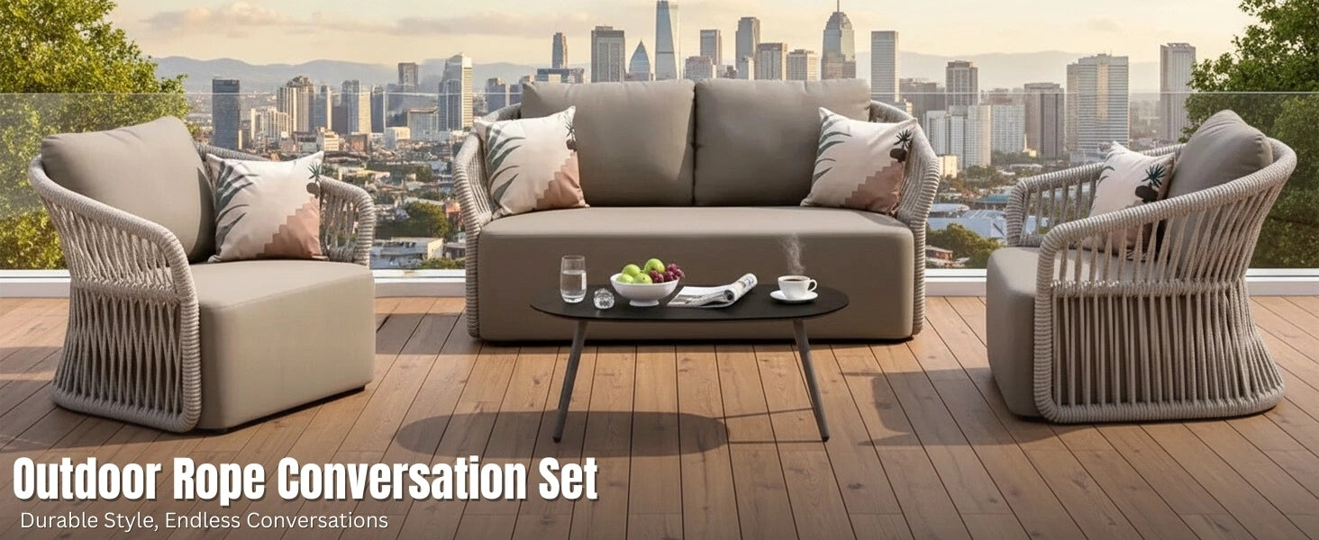 Elevate your outdoor living space with this luxurious 4-piece Outdoor Braid & Rope Sofa Set, designed to blend modern aesthetics with ultimate comfort. Crafted with a hand-braided rope design over a durable powder-coated metal frame, this set offers both style and strength to withstand all weather conditions. The 16-inch ultra-thick cushions ensure plush, supportive seating that feels like sinking into a cloud, making it perfect for long hours of relaxation with friends and family. The set includes a spacious 2-seater sofa, two single chairs, and a glass-top center table, providing a complete solution for patios, gardens, balconies, decks, poolside, or terrace setups. The glass tabletop adds a sleek touch while offering a sturdy surface for drinks, snacks, or décor items. Built to endure sun, rain, and varying climates, the braided rope and weather-resistant fabric cushions are designed for long-lasting outdoor performance. With its combination of modern craftsmanship, ergonomic design, and premium materials, this sofa set creates a welcoming lounge space that suits both casual gatherings and elegant outdoor entertaining.