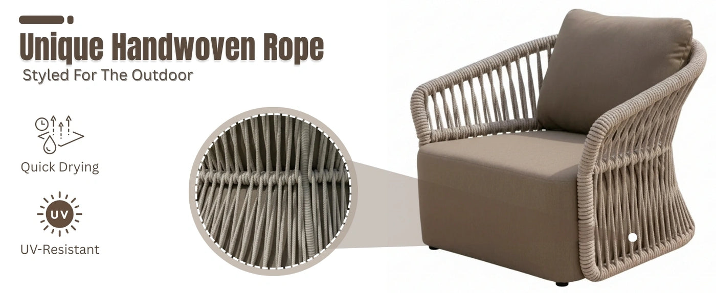 - All-Weather Resistant Materials : Rope, frame, and cushions are designed to resist fading, UV damage, and moisture.