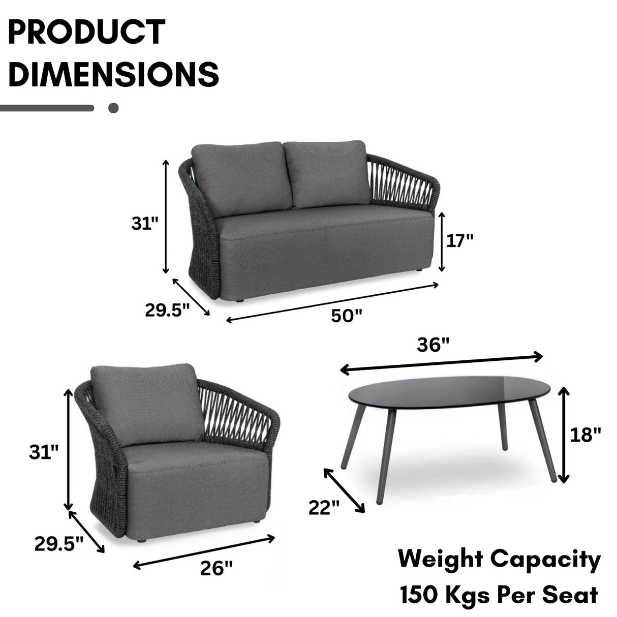 Elevate your outdoor living space with this luxurious 4-piece Outdoor Braid & Rope Sofa Set, designed to blend modern aesthetics with ultimate comfort. Crafted with a hand-braided rope design over a durable powder-coated metal frame, this set offers both style and strength to withstand all weather conditions. The 16-inch ultra-thick cushions ensure plush, supportive seating that feels like sinking into a cloud, making it perfect for long hours of relaxation with friends and family. The set includes a spacious 2-seater sofa, two single chairs, and a glass-top center table, providing a complete solution for patios, gardens, balconies, decks, poolside, or terrace setups. The glass tabletop adds a sleek touch while offering a sturdy surface for drinks, snacks, or décor items. Built to endure sun, rain, and varying climates, the braided rope and weather-resistant fabric cushions are designed for long-lasting outdoor performance. With its combination of modern craftsmanship, ergonomic design, and premium materials, this sofa set creates a welcoming lounge space that suits both casual gatherings and elegant outdoor entertaining.