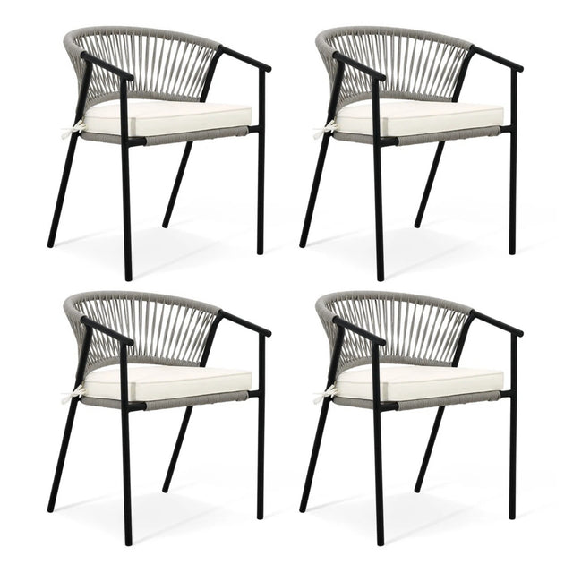 Elevate your outdoor dining experience with these stylish rope dining chairs featuring plush cushions for unmatched comfort. Expertly crafted with a powder-coated metal frame and handwoven weather-resistant rope, these chairs are built to withstand the elements while maintaining their elegant appeal. The breathable rope design ensures proper airflow, keeping you cool during warm days, while the soft, water-resistant cushions provide long-lasting seating comfort. Perfect for gardens, decks, lawns, and poolside settings, these chairs blend contemporary charm with durable performance. Their lightweight yet sturdy construction allows for easy mobility without compromising stability, making them a versatile addition to any outdoor space.