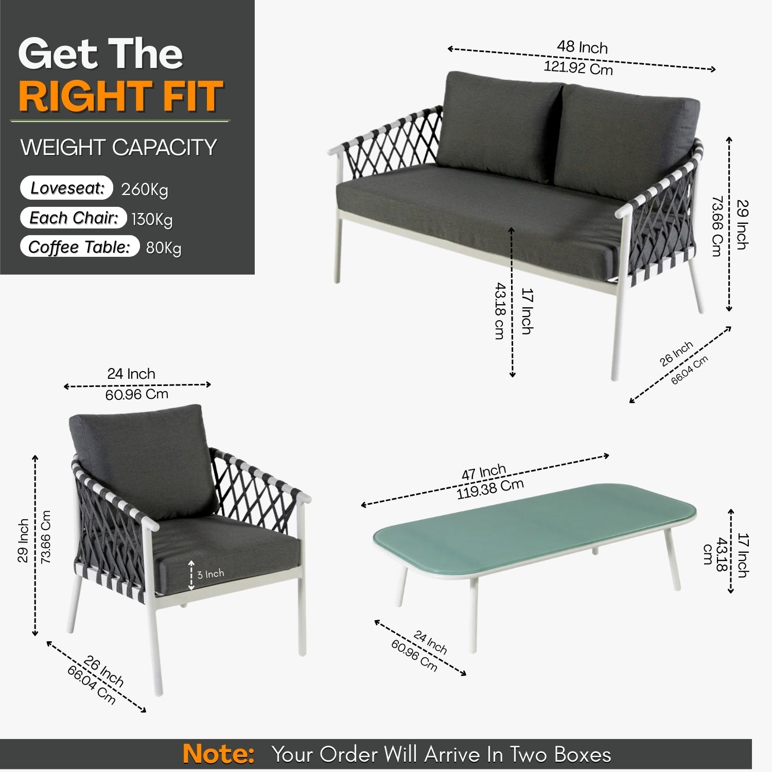 - 1 Double Seater Dimensions: 48″L×26″W×29″H