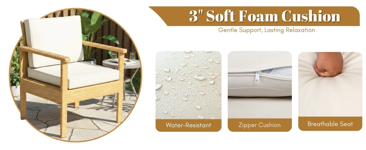 - Modern Yet Natural Aesthetic : The combination of earthy rattan texture and neutral cushion tones complements outdoor surroundings, creating a cozy and stylish atmosphere for gardens, balconies, and patios.