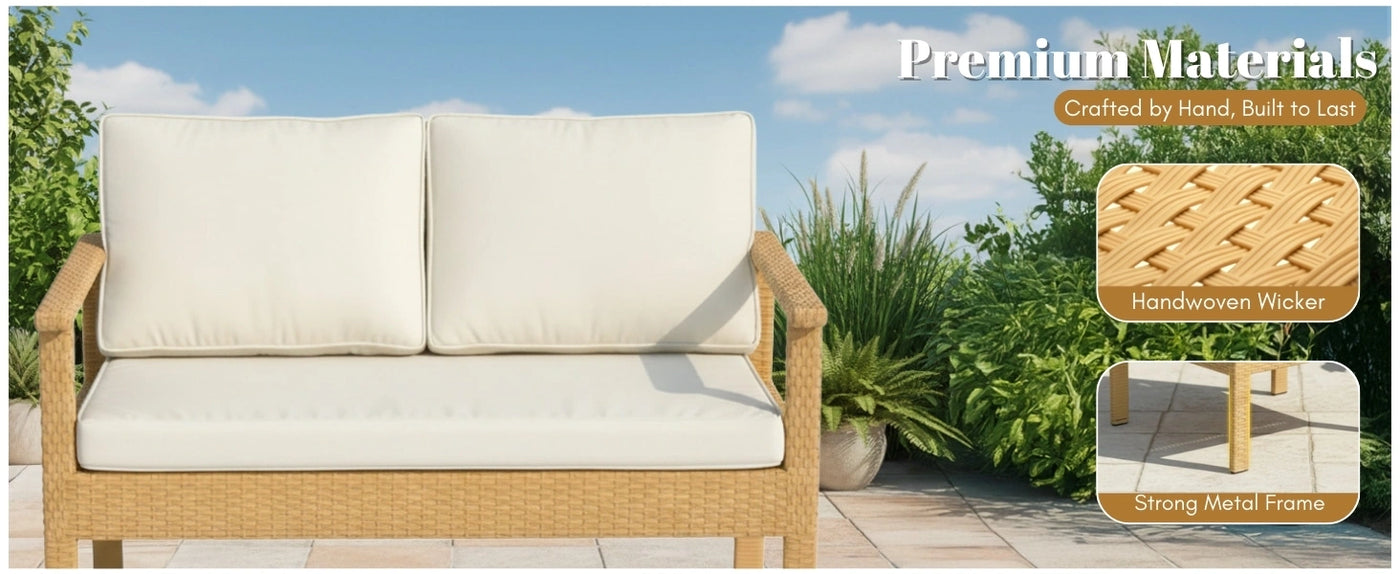 - All-Weather Wicker Rattan Construction : Crafted with handwoven premium synthetic rattan, the set is UV-resistant, fade-proof, and designed to withstand rain and sun perfect for year-round outdoor use.