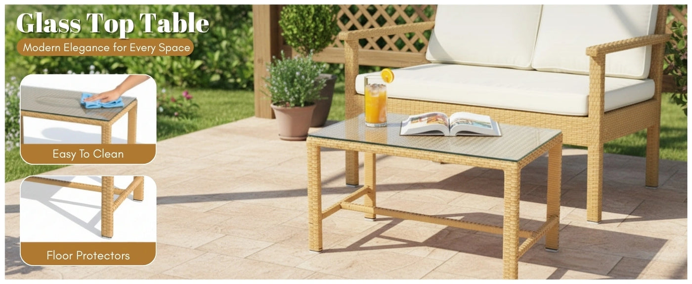 Elevate your garden, balcony, or backyard with this elegant 4-Piece Outdoor Patio Furniture Sofa Set a perfect blend of comfort, durability, and style. Crafted with premium all-weather handwoven wicker rattan, this conversation set is designed to withstand the elements while offering timeless charm in beige and white tones that blend effortlessly with any outdoor décor. The set includes two spacious single chairs, a wide loveseat, and a sturdy glass-top center table, making it ideal for entertaining guests, enjoying a quiet morning coffee, or relaxing with your family in the fresh air. Each seating piece comes with soft, washable cushions that are not only water resistant but also ultra-comfortable inviting you to sit back, relax, and unwind.