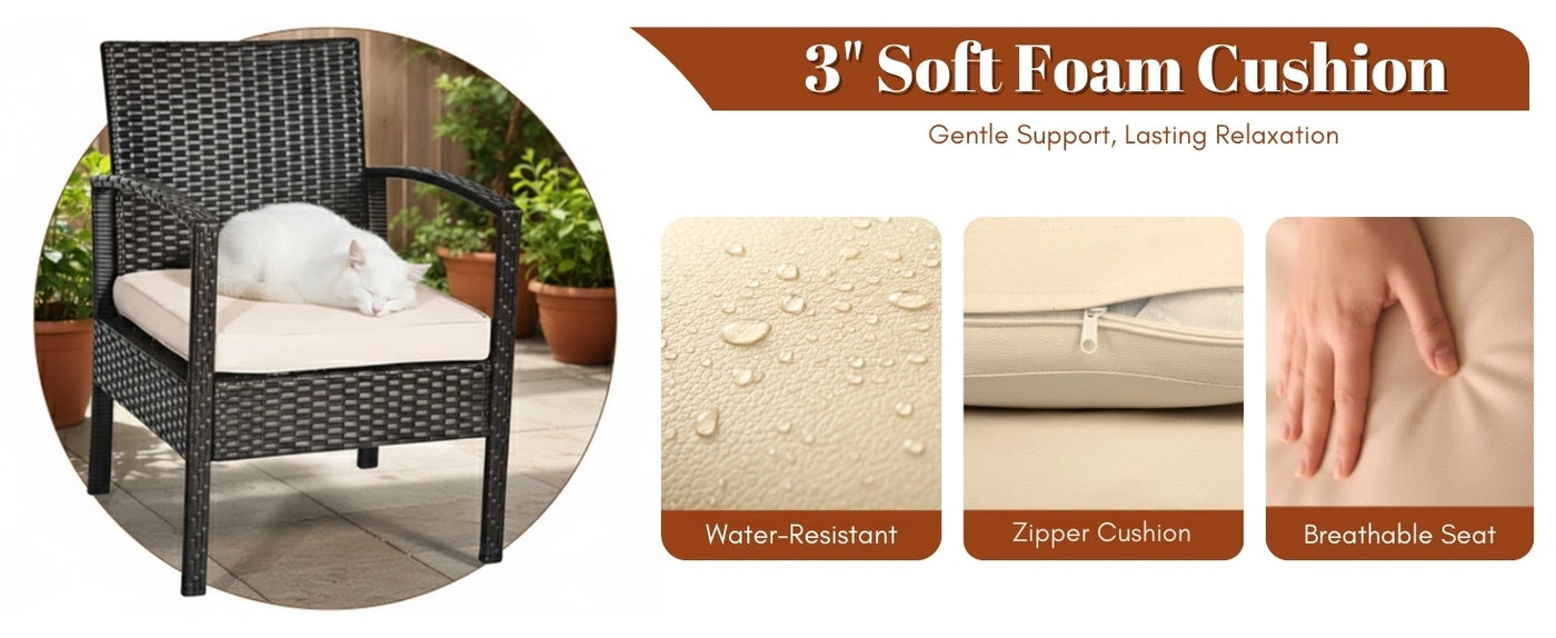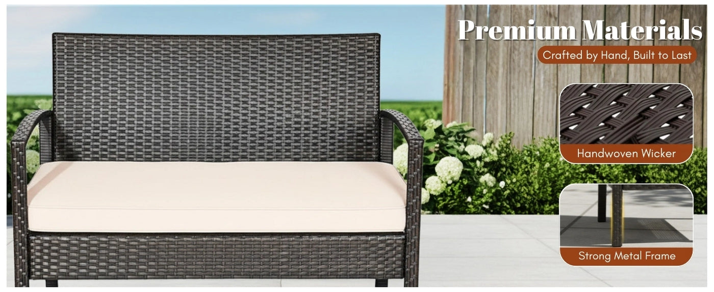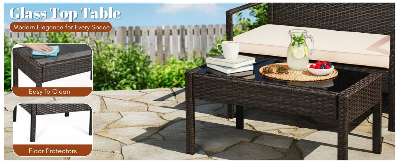 Transform your outdoor space into a stylish and relaxing retreat with this 4-Piece Patio Furniture Set. Designed with elegance, durability, and comfort in mind, this versatile rattan wicker conversation set is perfect for your porch, lawn, garden, balcony, or backyard. Whether you're enjoying your morning coffee, hosting a weekend gathering, or simply unwinding after a long day, this outdoor sectional sofa set brings comfort and charm to any setting. Crafted from high-quality handwoven rattan wicker and supported by a rust-resistant powder-coated metal frame, this set is built to withstand the elements while maintaining its visual appeal. The thick, soft cream cushions offer superior comfort, with removable and washable covers that make cleaning effortless. The center table features a glass top, providing a sleek and stable surface for drinks, snacks, or décor.