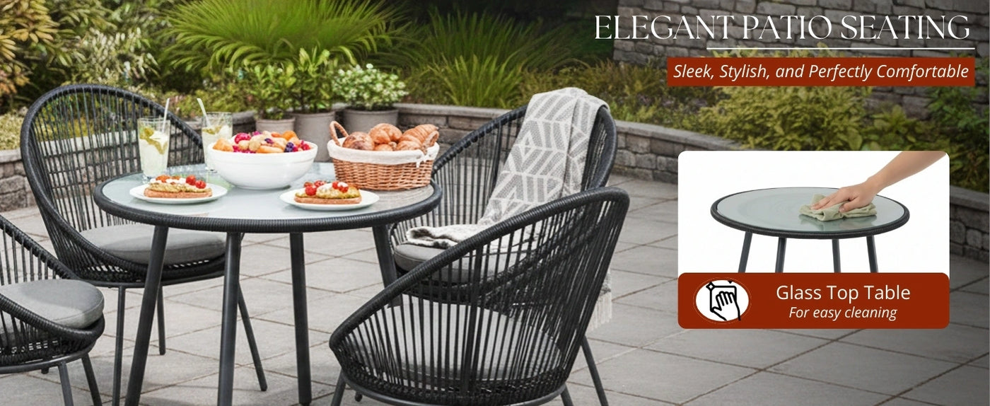 - Versatile for Any Outdoor Setting : Perfectly sized for balconies, poolside lounges, patios, or garden dining areas, this compact-yet-functional 5-piece set blends elegance and practicality.