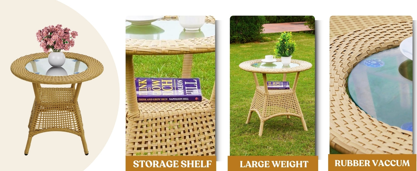 Elevate your garden, balcony, porch, or poolside with this 5-Piece Outdoor Rattan Wicker Patio Bistro Set a perfect blend of timeless style and lasting performance. Designed with an eye for detail and built for year-round use, this elegant set includes four cozy chairs, and a sleek glass top table. The beige all-weather wicker weaves a natural charm that complements any outdoor décor, while the sturdy powder-coated frame ensures stability, rust resistance, and long-lasting durability. This patio bistro set isn’t just furniture it’s an invitation to unwind, connect, and create lasting outdoor memories. With its weather-resistant wicker, modern design, and multi-functional utility, this set is perfect for small balconies or large backyards alike.
