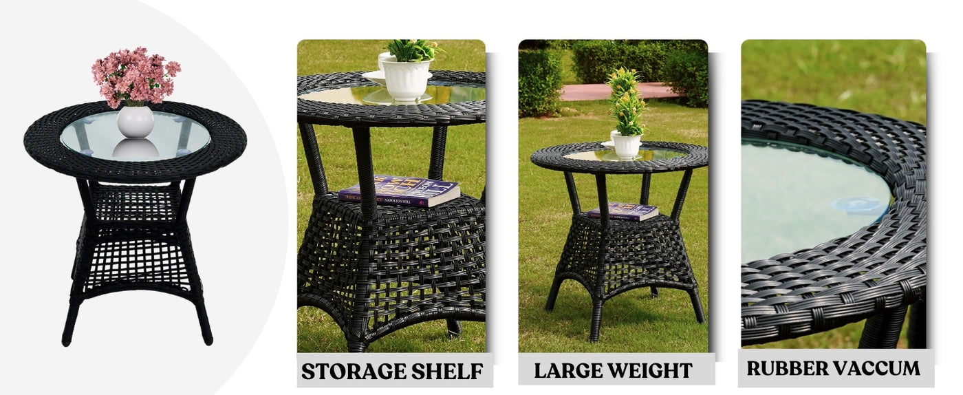 Elevate your garden, balcony, porch, or poolside with this 5-Piece Outdoor Rattan Wicker Patio Bistro Set a perfect blend of timeless style and lasting performance. Designed with an eye for detail and built for year-round use, this elegant set includes four cozy chairs, and a sleek glass top table. The black all-weather wicker weaves a natural charm that complements any outdoor décor, while the sturdy powder-coated metal frame ensures stability, rust resistance, and long-lasting durability. This patio bistro set isn’t just furniture it’s an invitation to unwind, connect, and create lasting outdoor memories. With its weather-resistant wicker, modern design, and multi-functional utility, this set is perfect for small balconies or large backyards alike.