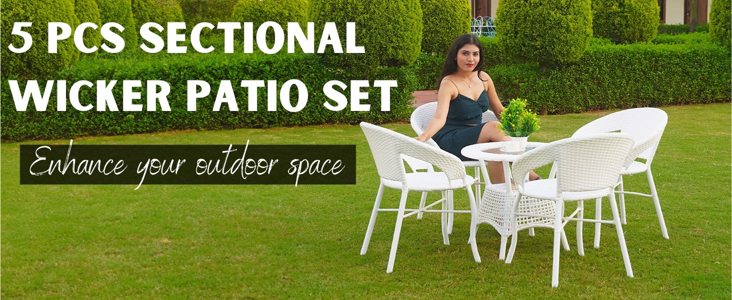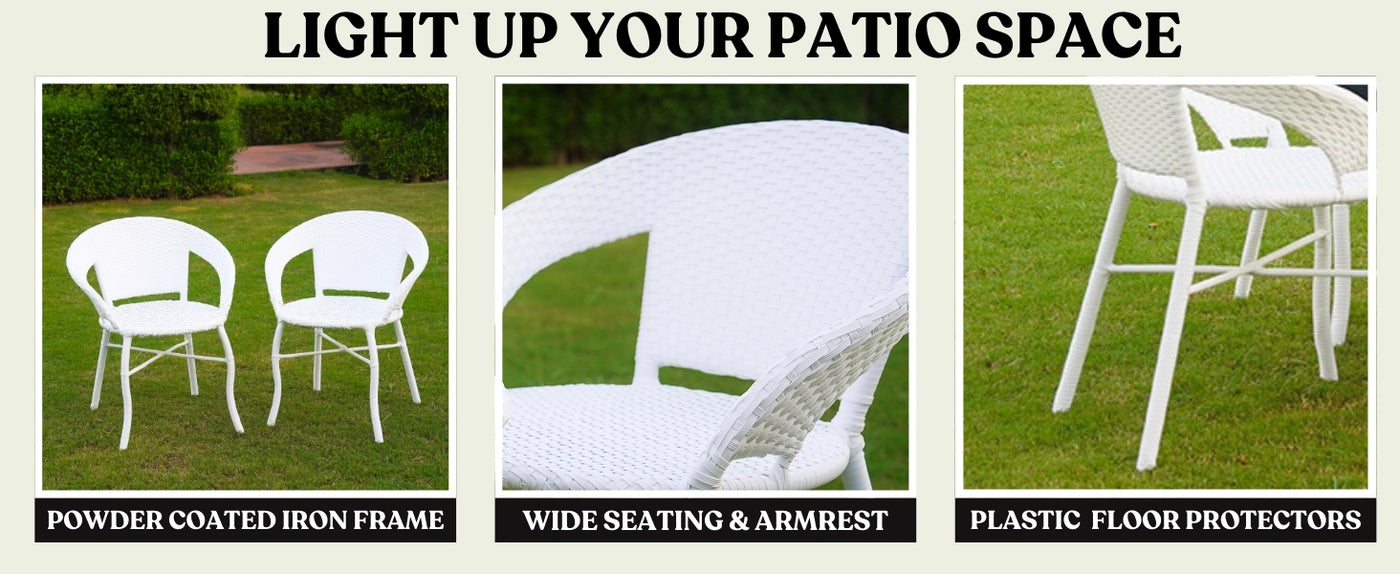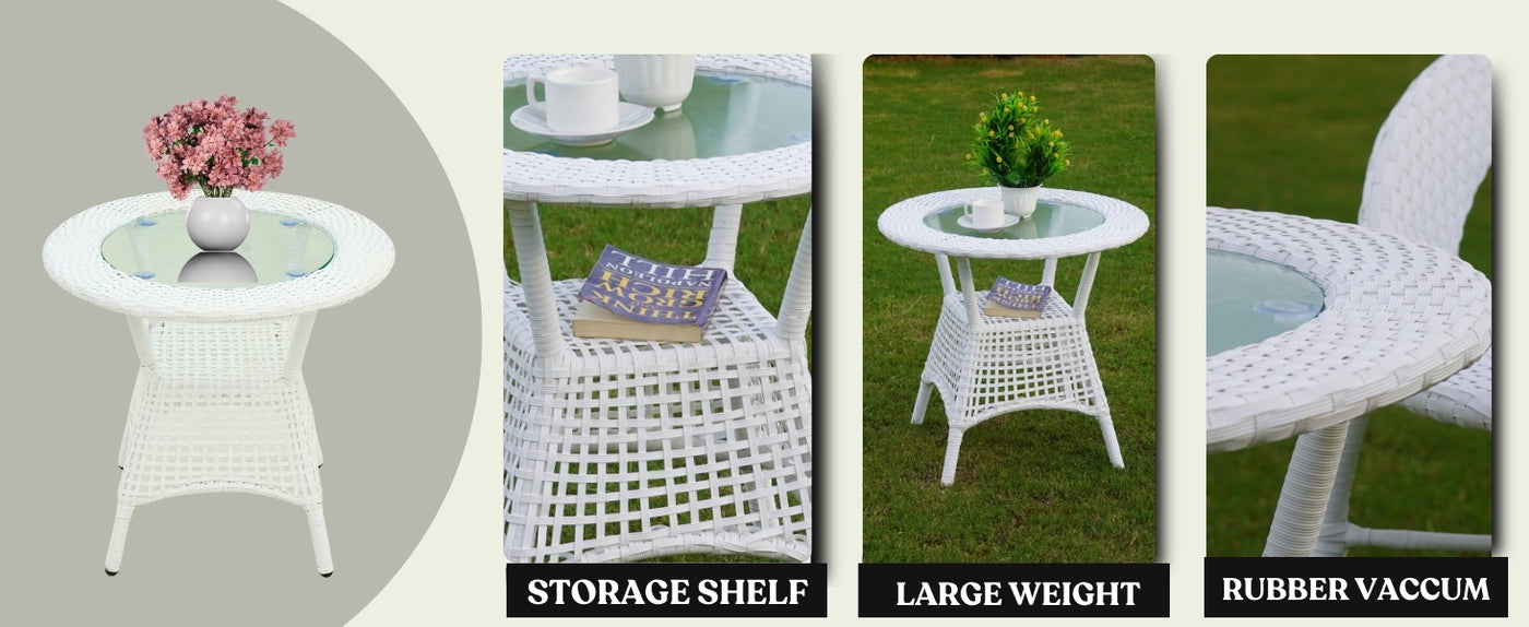 Elevate your garden, balcony, porch, or poolside with this 5-Piece Outdoor Rattan Wicker Patio Bistro Set a perfect blend of timeless style and lasting performance. Designed with an eye for detail and built for year-round use, this elegant set includes four cozy chairs, and a sleek glass top table. The white all-weather wicker weaves a natural charm that complements any outdoor décor, while the sturdy powder-coated frame ensures stability, rust resistance, and long-lasting durability. This patio bistro set isn’t just furniture it’s an invitation to unwind, connect, and create lasting outdoor memories. With its weather-resistant wicker, modern design, and multi-functional utility, this set is perfect for small balconies or large backyards alike.