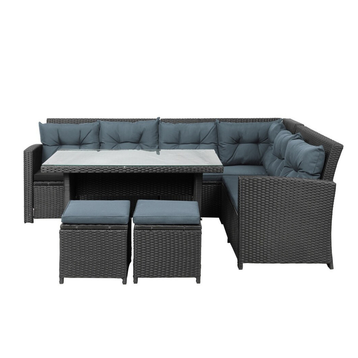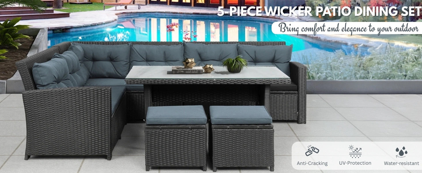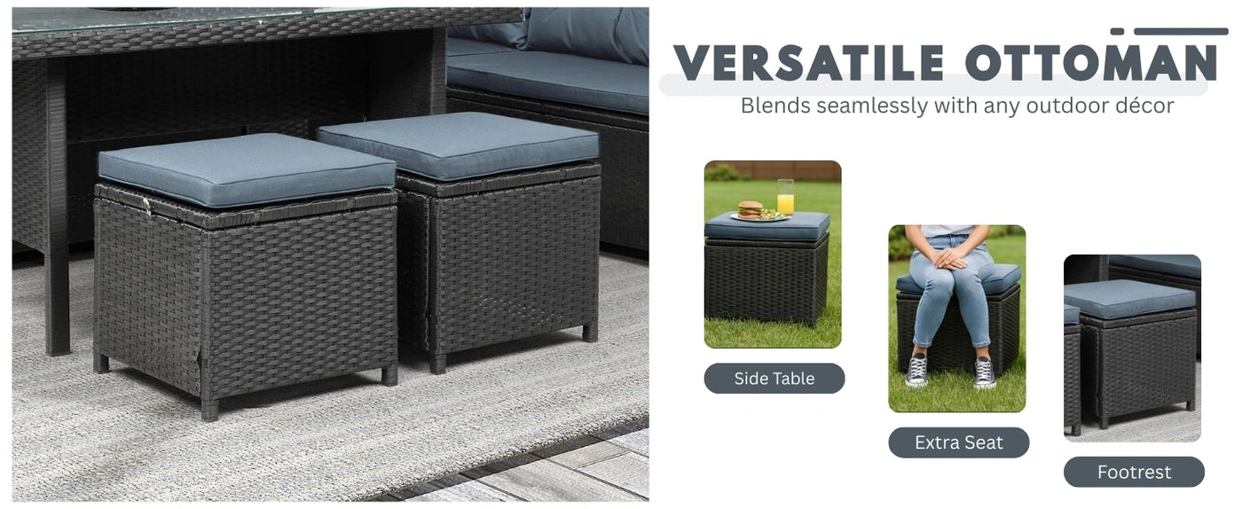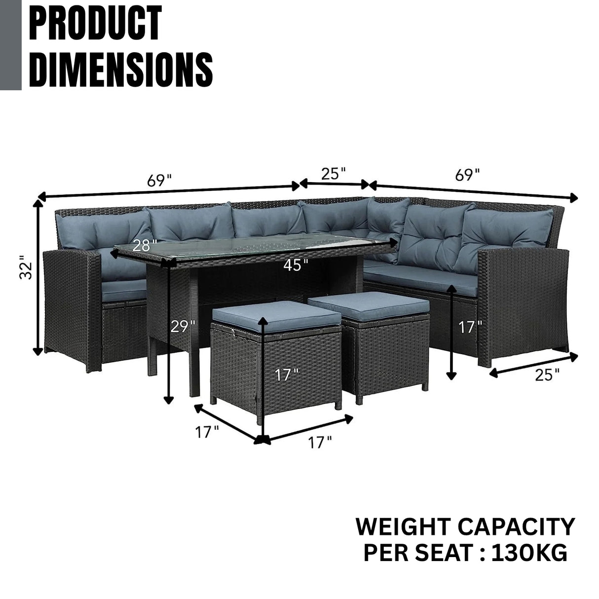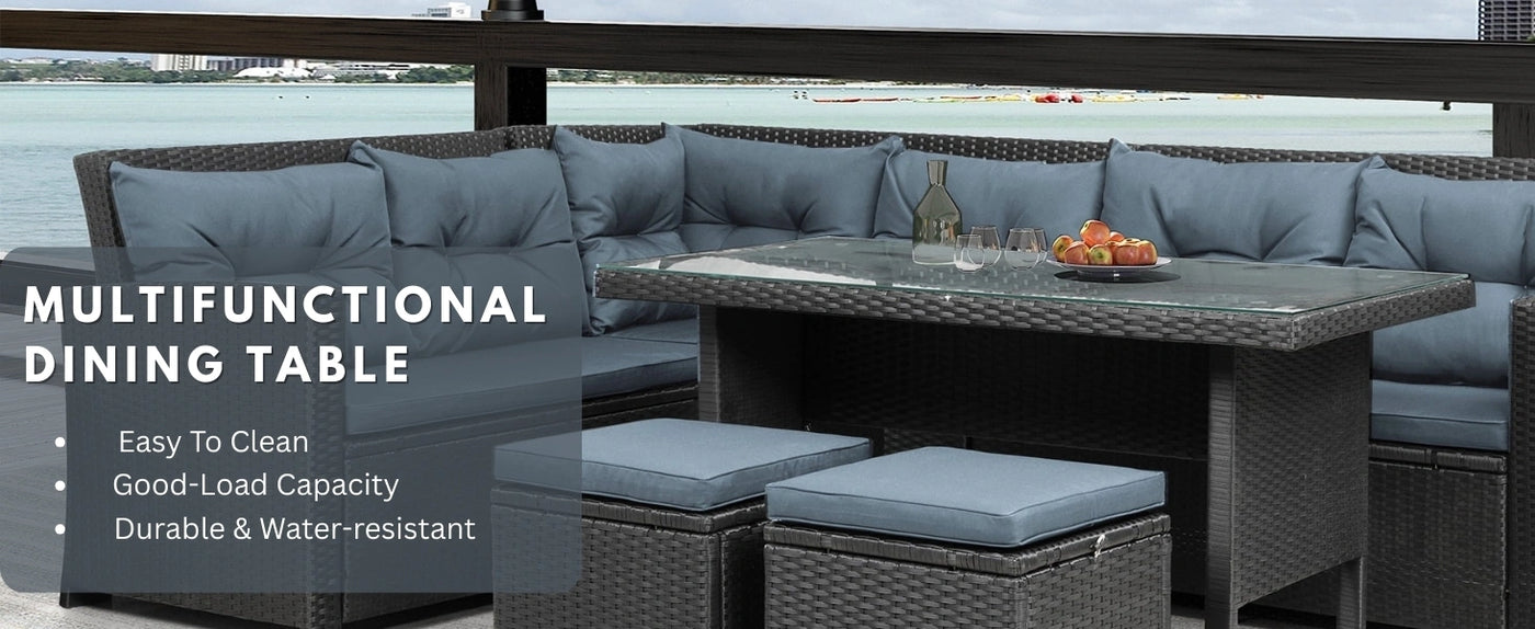 Elevate your outdoor living experience with this beautifully crafted Manual Weaving Wicker Sectional Sofa Set, designed to blend comfort, durability, and timeless style. Whether it's your porch, lawn, garden, or backyard, this premium HDPE rattan furniture set adds a luxurious yet practical touch to your outdoor setting. Handwoven using high-quality, weather-resistant HDPE wicker, the set ensures long-lasting durability through all seasons. The powder-coated metal frame provides a strong foundation that resists rust and corrosion, making it ideal for extended outdoor use. Designed with user comfort in mind, this set includes thick, soft cushions with washable covers, ensuring a plush seating experience that’s easy to maintain. The modular design allows you to arrange the pieces to best suit your space and style, offering maximum flexibility for gatherings, lounging, or quiet evening relaxation. The addition of a matching ottoman enhances comfort, providing a spot to stretch out your legs or use as extra seating. The glass-top coffee table serves as the perfect centerpiece—great for placing snacks, drinks, or decorative items while entertaining guests.