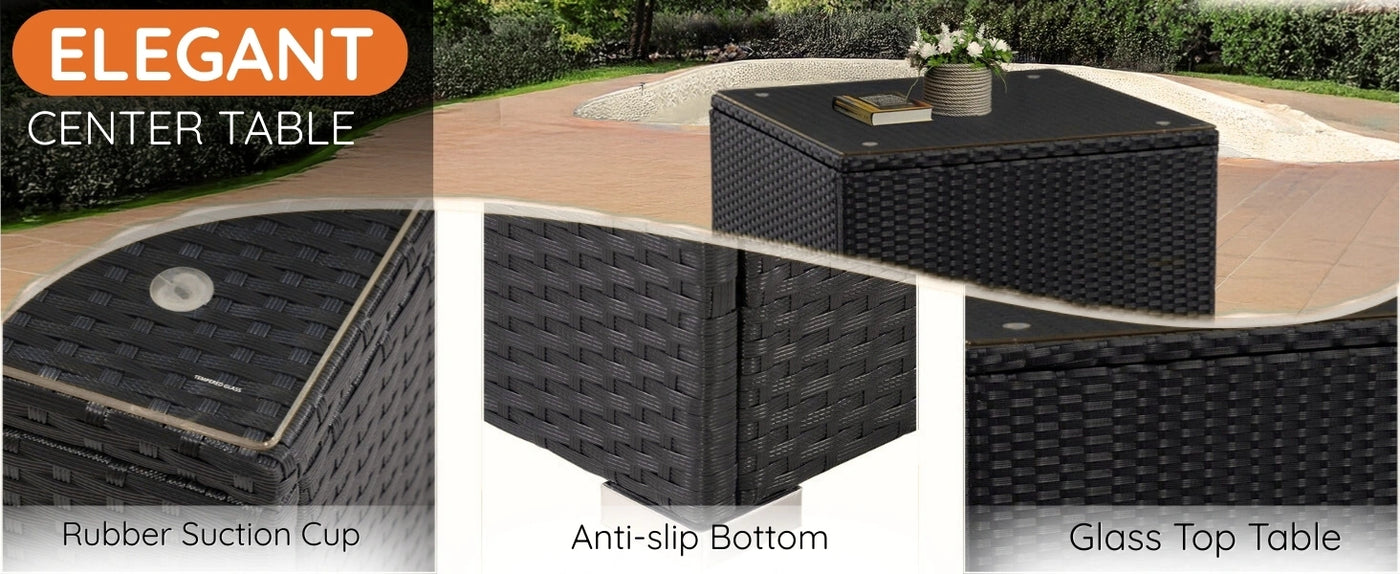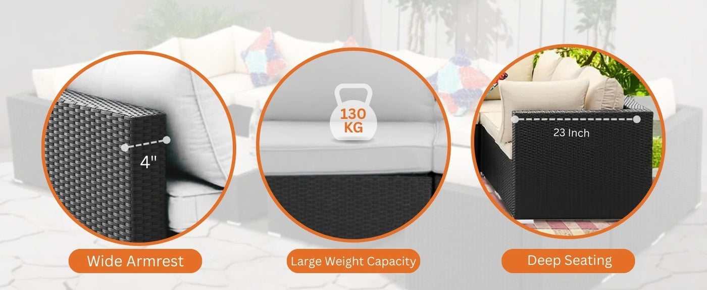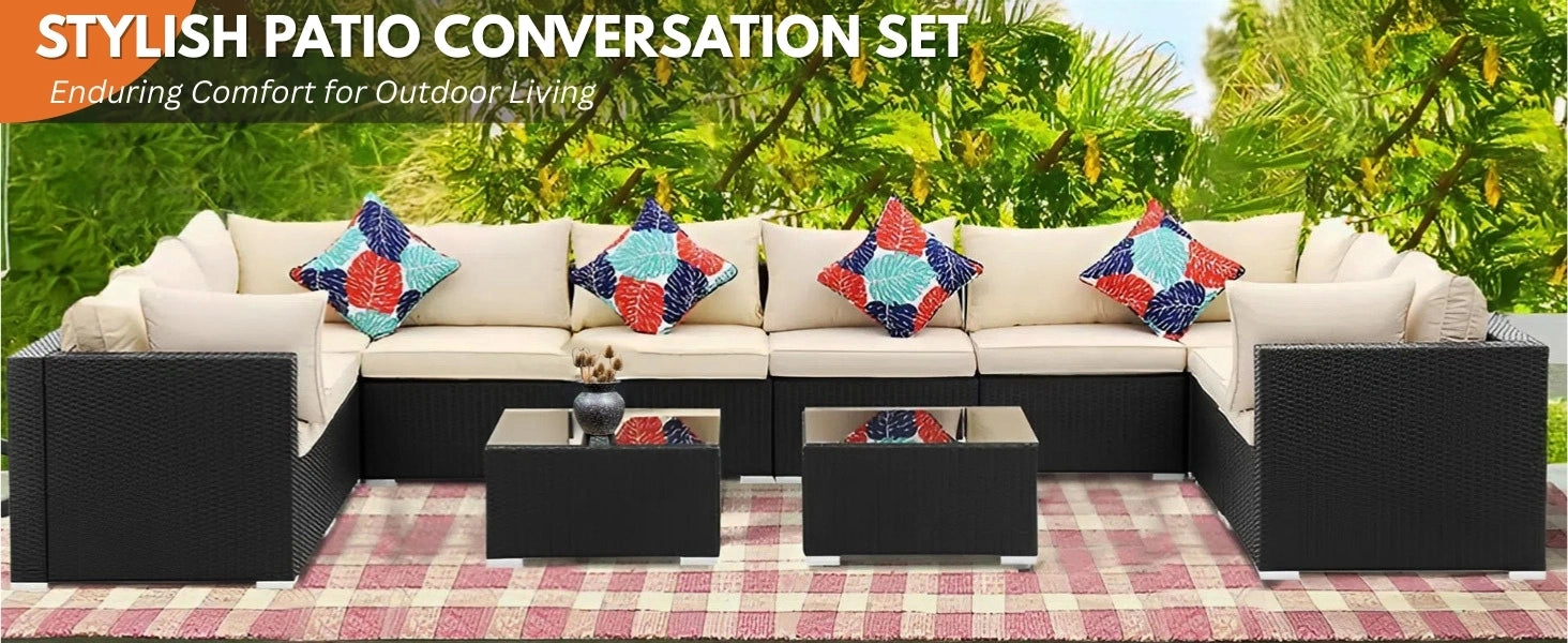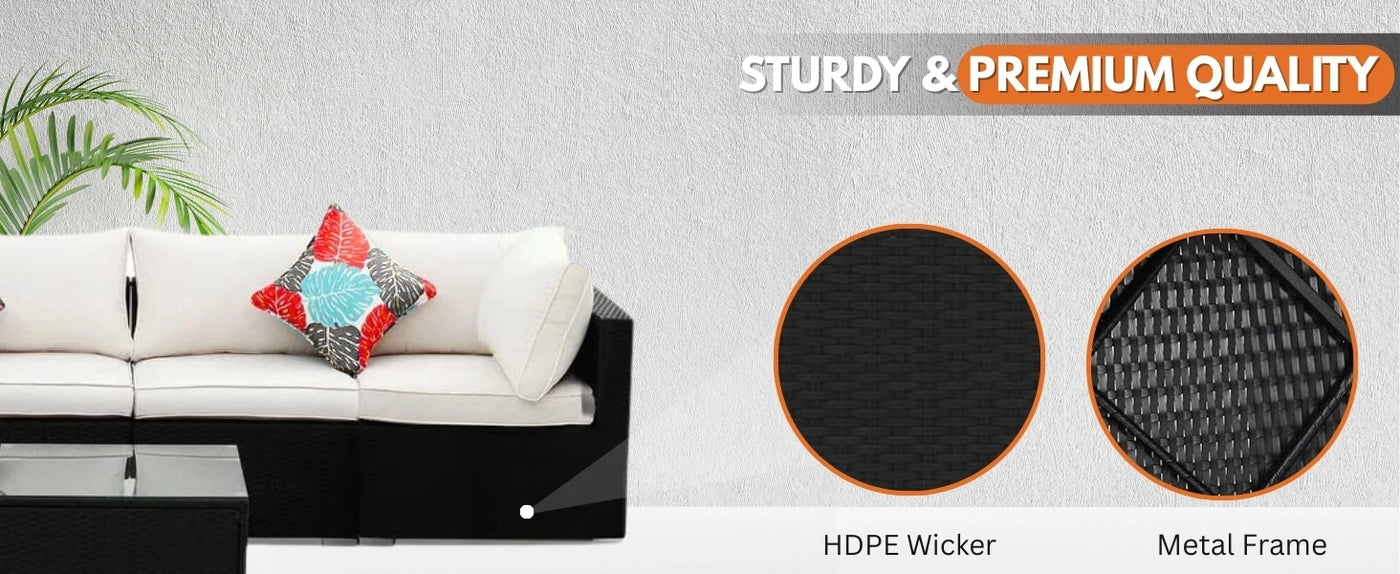 Upgrade your outdoor living space with this beautifully crafted Outdoor Conversation Set, designed to bring luxury, comfort, and functionality to your porch, lawn, garden, or backyard. Handwoven with premium-quality HDPE rattan wicker in a rich black finish, this sectional sofa set combines timeless aesthetics with all-weather durability. The soft cushions add a warm contrast while providing a plush, relaxing experience every time you sit. This modular patio set features a spacious L-shaped sectional sofa and a sturdy glass-top coffee tables perfect for everything from cozy family evenings to lively outdoor gatherings. The lightweight yet powder-coated metal frame offers stability without compromising portability, making rearrangement effortless. Plus, the removable cushion covers are washable, ensuring your set stays fresh and inviting season after season. Whether you're enjoying your morning coffee, hosting guests, or simply relaxing under the stars, this conversation set adapts to your lifestyle.