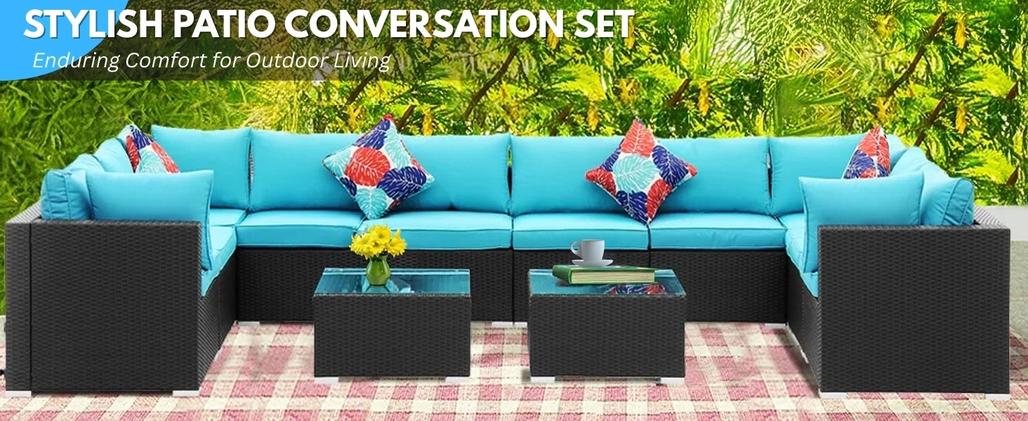Upgrade your outdoor living space with this beautifully crafted Outdoor Conversation Set, designed to bring luxury, comfort, and functionality to your porch, lawn, garden, or backyard. Handwoven with premium-quality HDPE rattan wicker in a rich black finish, this sectional sofa set combines timeless aesthetics with all-weather durability. The soft cushions add a warm contrast while providing a plush, relaxing experience every time you sit. This modular patio set features a spacious L-shaped sectional sofa and a sturdy glass-top coffee tables—perfect for everything from cozy family evenings to lively outdoor gatherings. The lightweight yet powder-coated metal frame offers stability without compromising portability, making rearrangement effortless. Plus, the removable cushion covers are washable, ensuring your set stays fresh and inviting season after season. Whether you're enjoying your morning coffee, hosting guests, or simply relaxing under the stars, this conversation set adapts to your lifestyle.