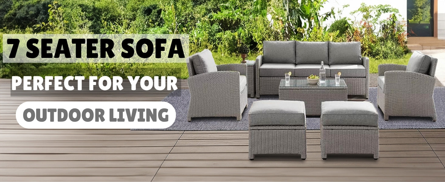 • Complete 7-Seater Configuration : Includes one spacious 3-seater sofa, two comfortable single-seaters, two multifunctional ottomans, one elegant center table, and two matching side tables ideal for large families or entertaining guests outdoors.