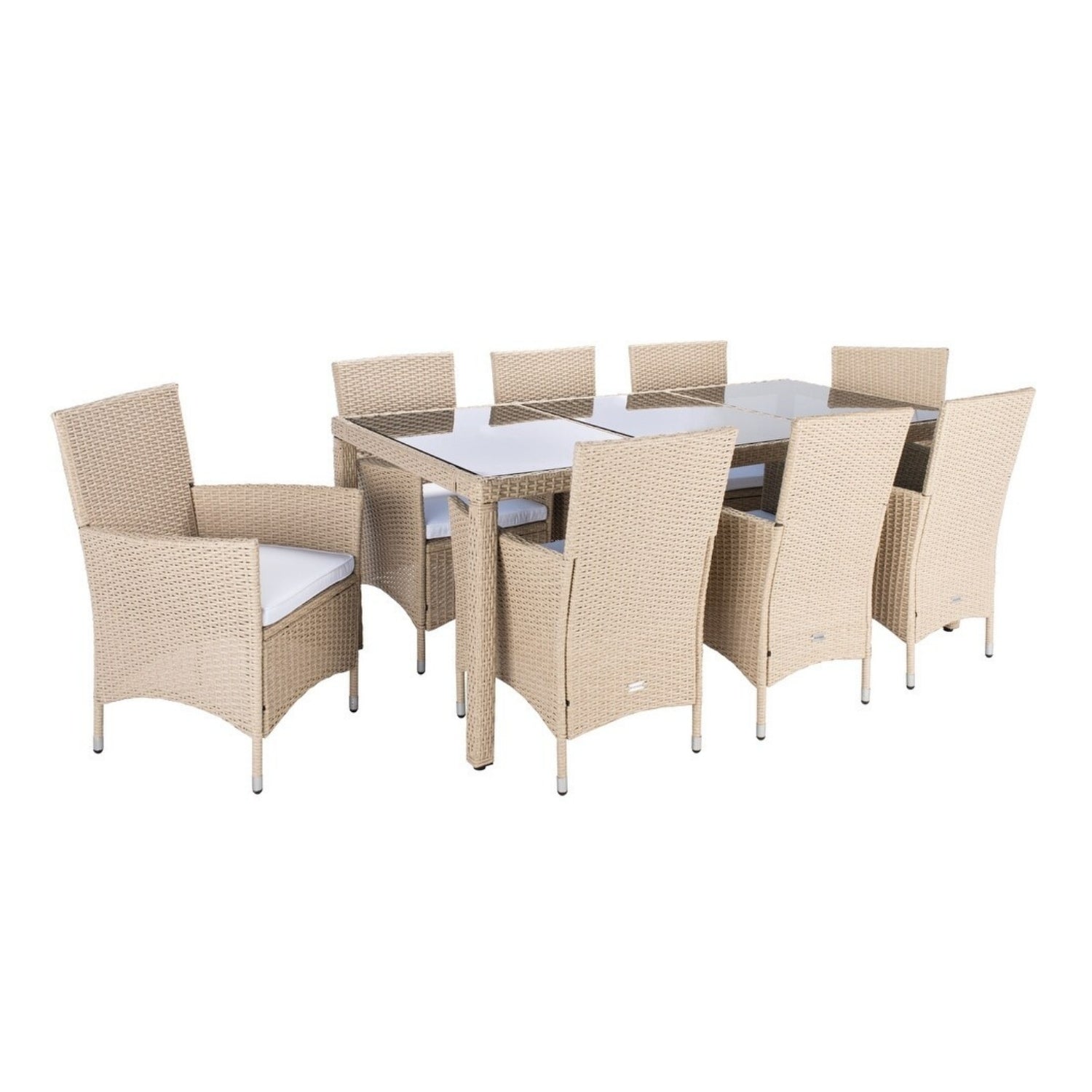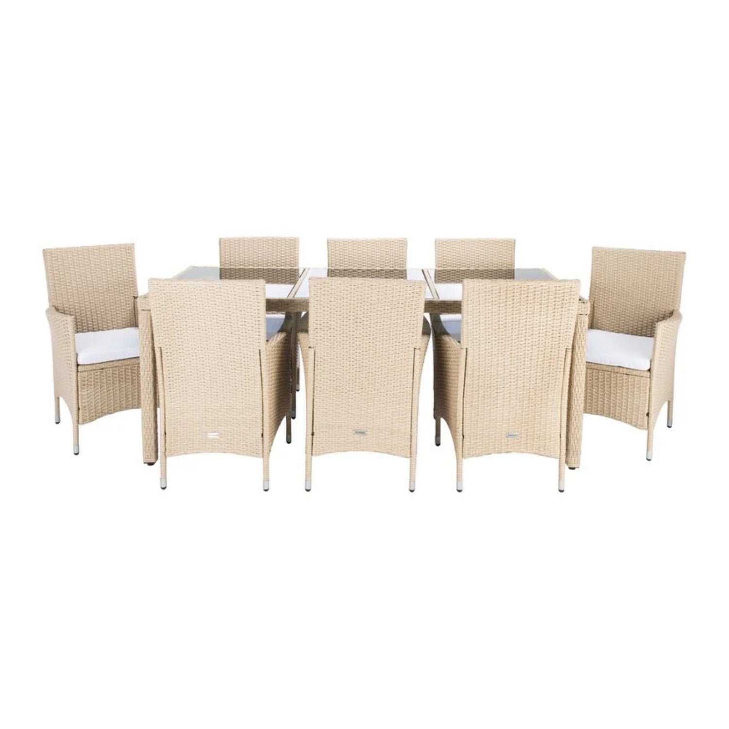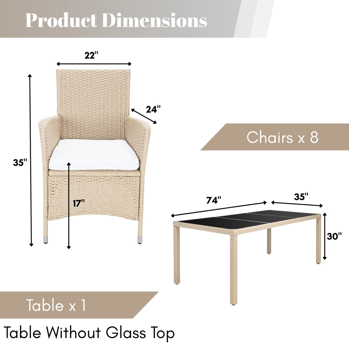 Create a stylish and functional outdoor dining space with this 9-Piece Outdoor Patio Rattan Dining Set, featuring a table and 8 cushioned chairs. Designed for comfort and built for durability, this set is perfect for gardens, balconies, poolside lounges, or backyard gatherings. Crafted with weather-resistant HDPE rattan and a rustproof powder-coated metal frame, it offers year-round durability against UV rays, rain, and fading. The tabletop provides a modern touch and easy maintenance, while the plush, removable seat cushions ensure long-lasting comfort and support. With a space-saving stackable design, this outdoor dining set combines style, function, and comfort ideal for hosting friends and family outdoors.