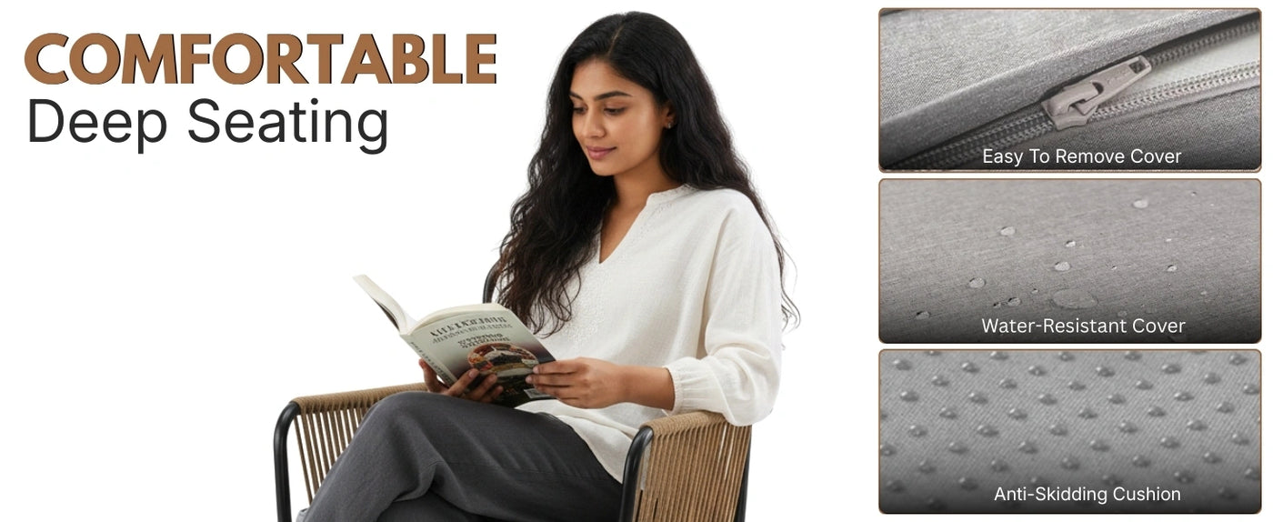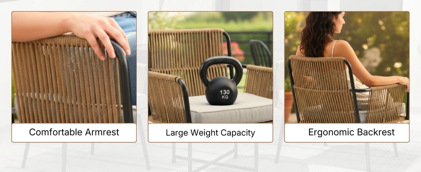 - Comfortable Seating : Ergonomically designed chairs with breathable rope weave and soft, removable cushions provide superior comfort for extended lounging.