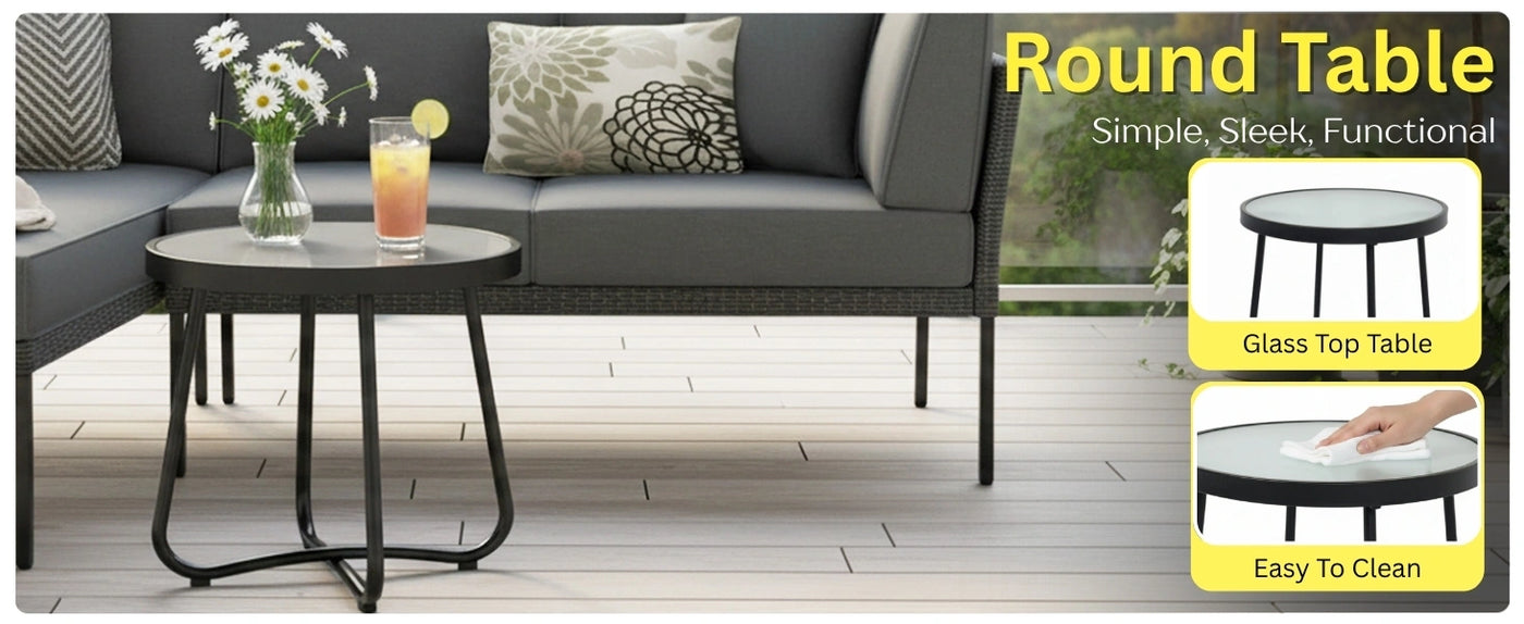 - Stylish & Functional Glass-Top Center Table : Includes a sleek and sturdy center table with a glass top perfect for serving drinks, snacks, or decor items outdoors.