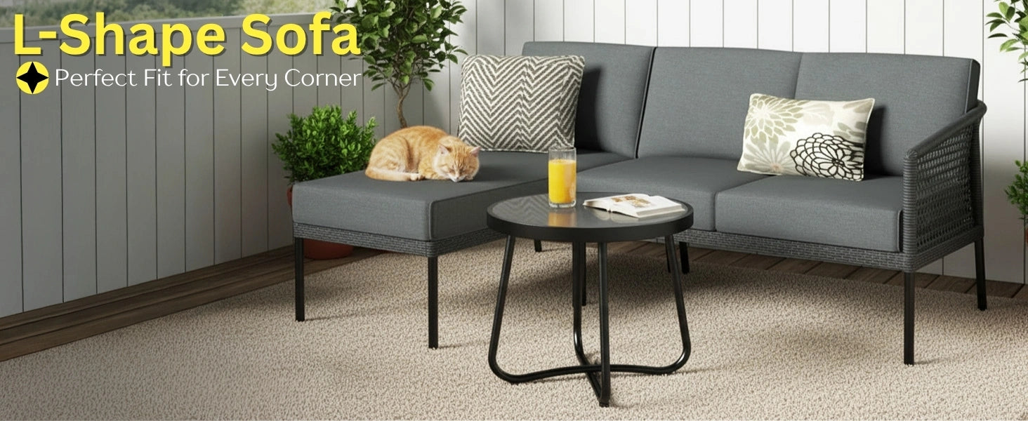 L-Shaped Patio Conversation Sofa Set with Thick Cushions & Side Table (Grey)