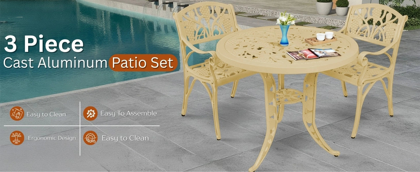 Elevate your outdoor living with this elegant 3-piece cast aluminium patio set, featuring two stylish chairs and a matching center table. Designed for durability and timeless appeal, this set is crafted from high-quality cast aluminium with a rustproof and weather-resistant finish, making it ideal for year-round outdoor use. The intricate design details bring a touch of sophistication to your patio, balcony, or garden while the lightweight yet sturdy build ensures easy movement without compromising stability. Perfect for morning coffee, evening relaxation, or intimate conversations, this set combines comfort, strength, and classic aesthetics. The center table includes a smooth, easy-to-clean surface, ideal for drinks, snacks, or decorative accents, making it both functional and attractive. Whether placed in a garden nook, poolside, or balcony, this set creates a welcoming space for relaxation and enjoyment.