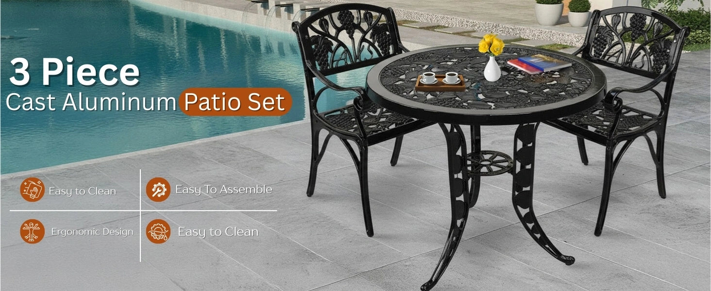 Elevate your outdoor living with this elegant 3-piece cast aluminium patio set, featuring two stylish chairs and a matching center table. Designed for durability and timeless appeal, this set is crafted from high-quality cast aluminium with a rustproof and weather-resistant finish, making it ideal for year-round outdoor use. The intricate design details bring a touch of sophistication to your patio, balcony, or garden while the lightweight yet sturdy build ensures easy movement without compromising stability. Perfect for morning coffee, evening relaxation, or intimate conversations, this set combines comfort, strength, and classic aesthetics. The center table includes a smooth, easy-to-clean surface, ideal for drinks, snacks, or decorative accents, making it both functional and attractive. Whether placed in a garden nook, poolside, or balcony, this set creates a welcoming space for relaxation and enjoyment.