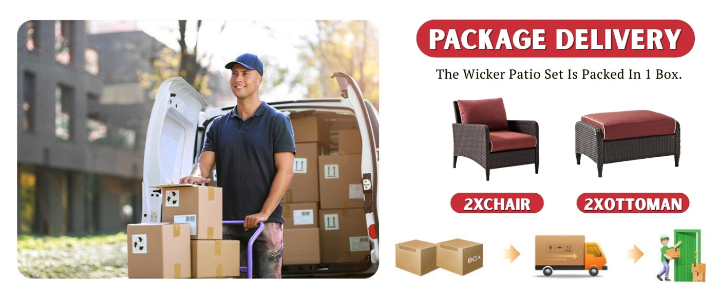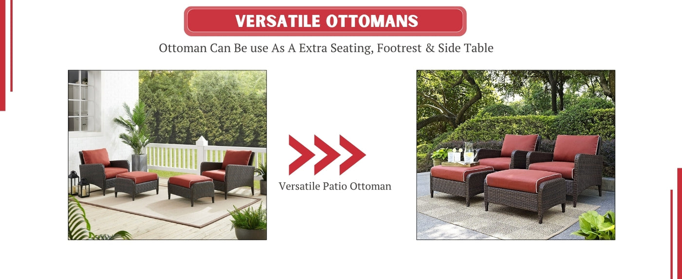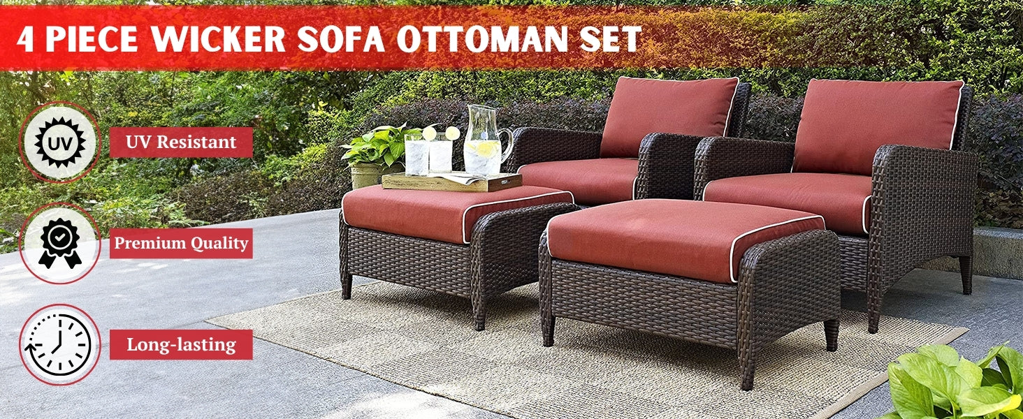 Turn your outdoor space into a cozy retreat with this elegant 4-Piece Patio Furniture Conversation Set. Designed to combine comfort, style, and durability, this bistro-style set is perfect for everything from casual lounging to evening get-togethers. Crafted with premium handwoven all-weather wicker in a rich dark brown finish, it seamlessly complements outdoor décors while withstanding sun, rain, and daily wear. The set includes two cushioned armchairs & two versatile ottomans. The red-colored cushions add a refreshing contrast and are filled with thick, high-density foam to provide cloud-like relaxation. The removable cushion covers are easy to clean, making maintenance a breeze. Whether you're sipping morning coffee on your porch or entertaining guests by the pool, the ergonomic design of the chairs and the added footrests ensure a perfect balance of luxury and function. The lightweight yet sturdy powder-coated metal frame ensures long-lasting performance without compromising portability. Make your outdoors an extension of your home this 4-piece conversation set offers the ideal blend of charm, convenience, and comfort for any season.