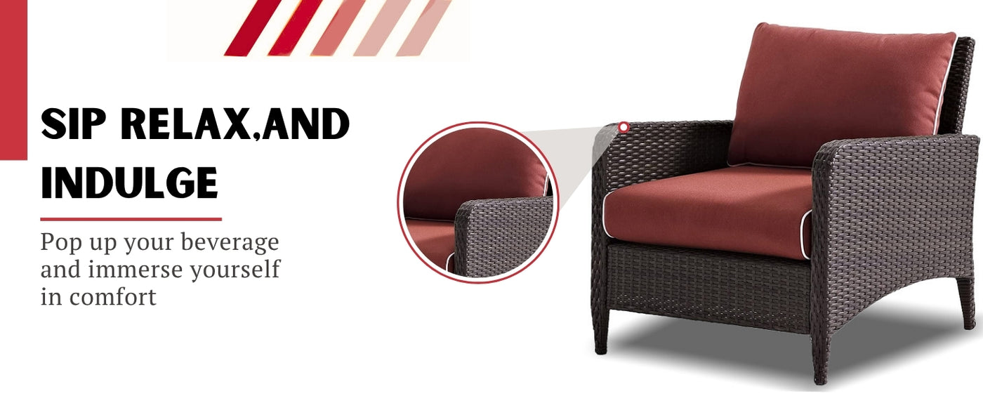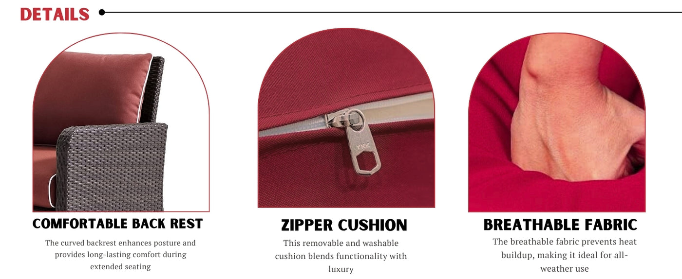 • Plush Red Cushions with Zippers : 3” thick seat cushions provide soft, supportive comfort during long sitting sessions. Water-resistant, removable covers are easy to clean and maintain for outdoor durability.