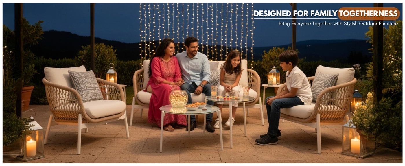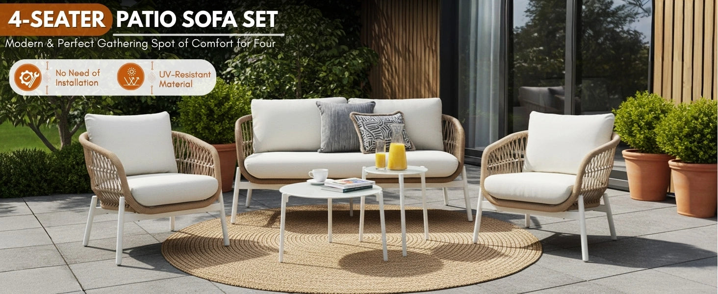 Transform your outdoor space into a serene retreat with this Outdoor 4-Seater Rope Sofa Conversation Set, a perfect blend of modern elegance and functional comfort. Designed for those who love to unwind, entertain, and enjoy nature, this premium set combines sleek aesthetics with durable materials to create a cozy oasis right in your garden, patio, or poolside. Crafted with a sturdy powder-coated metal frame and hand-woven weather-resistant rope, this conversation set is built to withstand sun, rain, and changing seasons without compromising on style. The ergonomic design of the sofa offers excellent lumbar support, while the soft, water-resistant cushions ensure cloud-like comfort for long hours of relaxation. Each cushion features removable, washable covers for easy maintenance, making it ideal for everyday outdoor use. At the heart of the set is a stylish round glass top center & side table both stable and elegant perfect for serving snacks, drinks, or displaying your favorite decor items during outdoor gatherings.