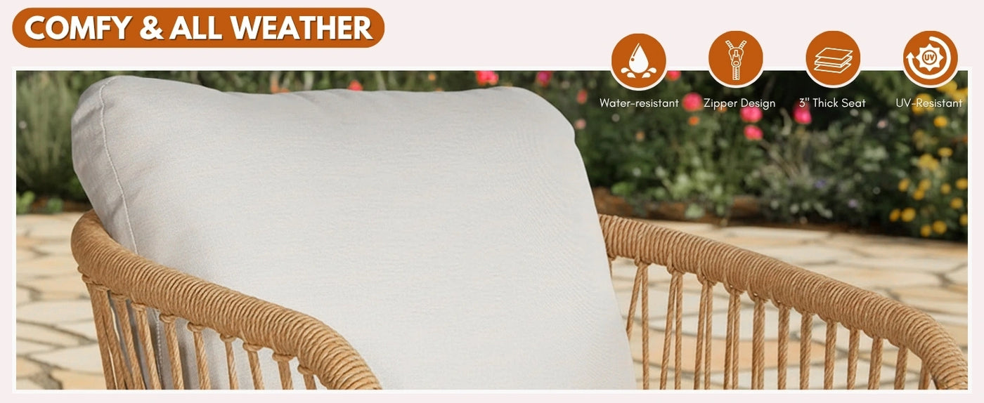 - Comfortable All-Weather Cushions : Thick, water-resistant cushions with breathable fabric covers ensure plush seating and year-round comfort.