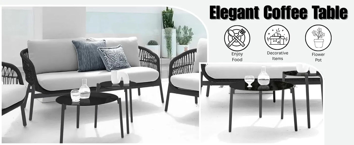 Transform your outdoor space into a serene retreat with this Outdoor 4-Seater Rope Sofa Conversation Set, a perfect blend of modern elegance and functional comfort. Designed for those who love to unwind, entertain, and enjoy nature, this premium set combines sleek aesthetics with durable materials to create a cozy oasis right in your garden, patio, or poolside. Crafted with a sturdy powder-coated metal frame and hand-woven weather-resistant rope, this conversation set is built to withstand sun, rain, and changing seasons without compromising on style. The ergonomic design of the sofa offers excellent lumbar support, while the soft, water-resistant cushions ensure cloud-like comfort for long hours of relaxation. Each cushion features removable, washable covers for easy maintenance, making it ideal for everyday outdoor use. At the heart of the set is a stylish round glass top center & side table both stable and elegant perfect for serving snacks, drinks, or displaying your favorite decor items during outdoor gatherings.