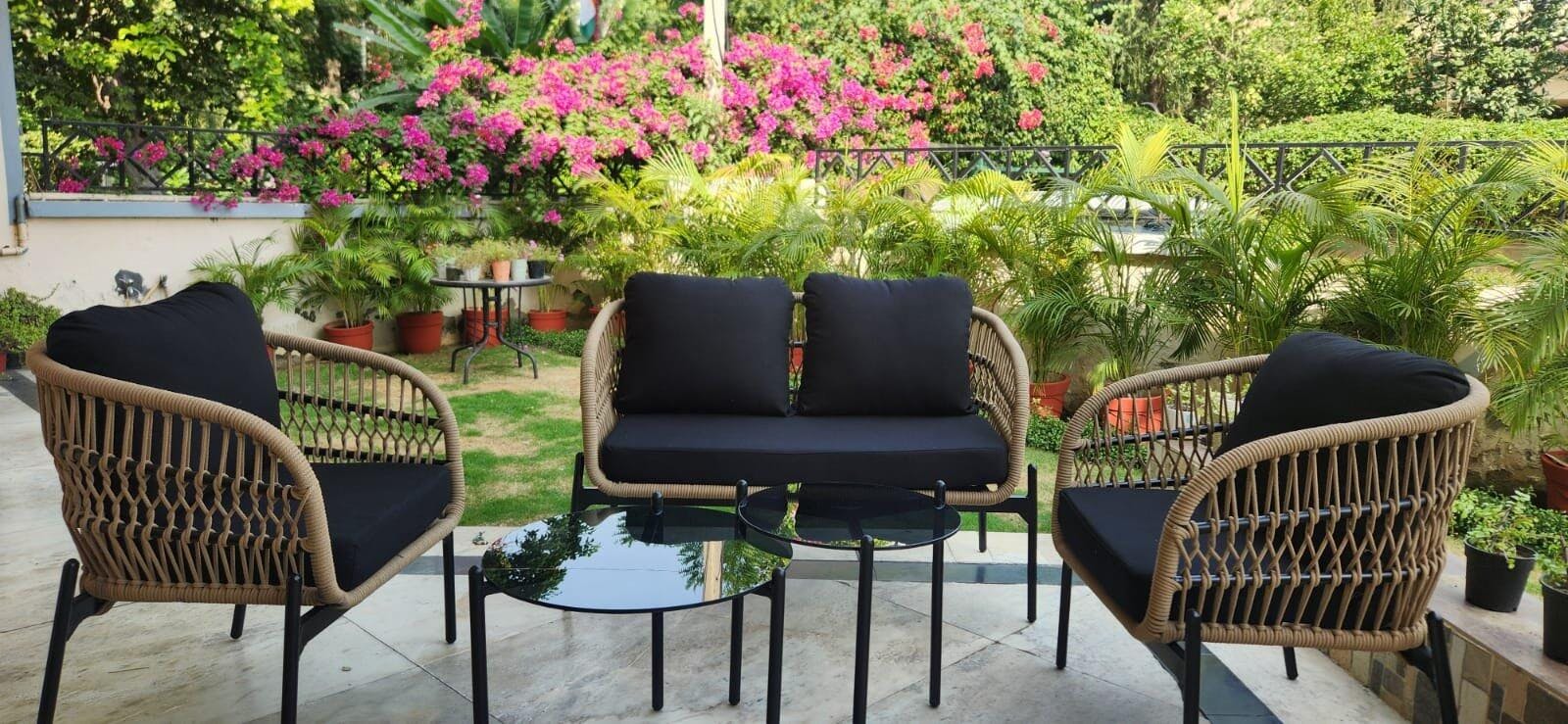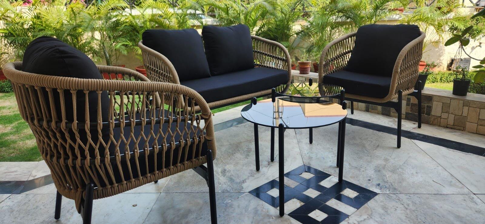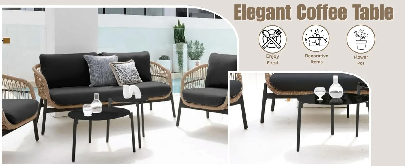 Transform your outdoor space into a serene retreat with this Outdoor 4-Seater Rope Sofa Conversation Set, a perfect blend of modern elegance and functional comfort. Designed for those who love to unwind, entertain, and enjoy nature, this premium set combines sleek aesthetics with durable materials to create a cozy oasis right in your garden, patio, or poolside. Crafted with a sturdy powder-coated metal frame and hand-woven weather-resistant rope, this conversation set is built to withstand sun, rain, and changing seasons without compromising on style. The ergonomic design of the sofa offers excellent lumbar support, while the soft, water-resistant cushions ensure cloud-like comfort for long hours of relaxation. Each cushion features removable, washable covers for easy maintenance, making it ideal for everyday outdoor use. At the heart of the set is a stylish round glass top center & side table both stable and elegant perfect for serving snacks, drinks, or displaying your favorite decor items during outdoor gatherings.