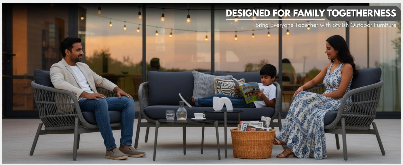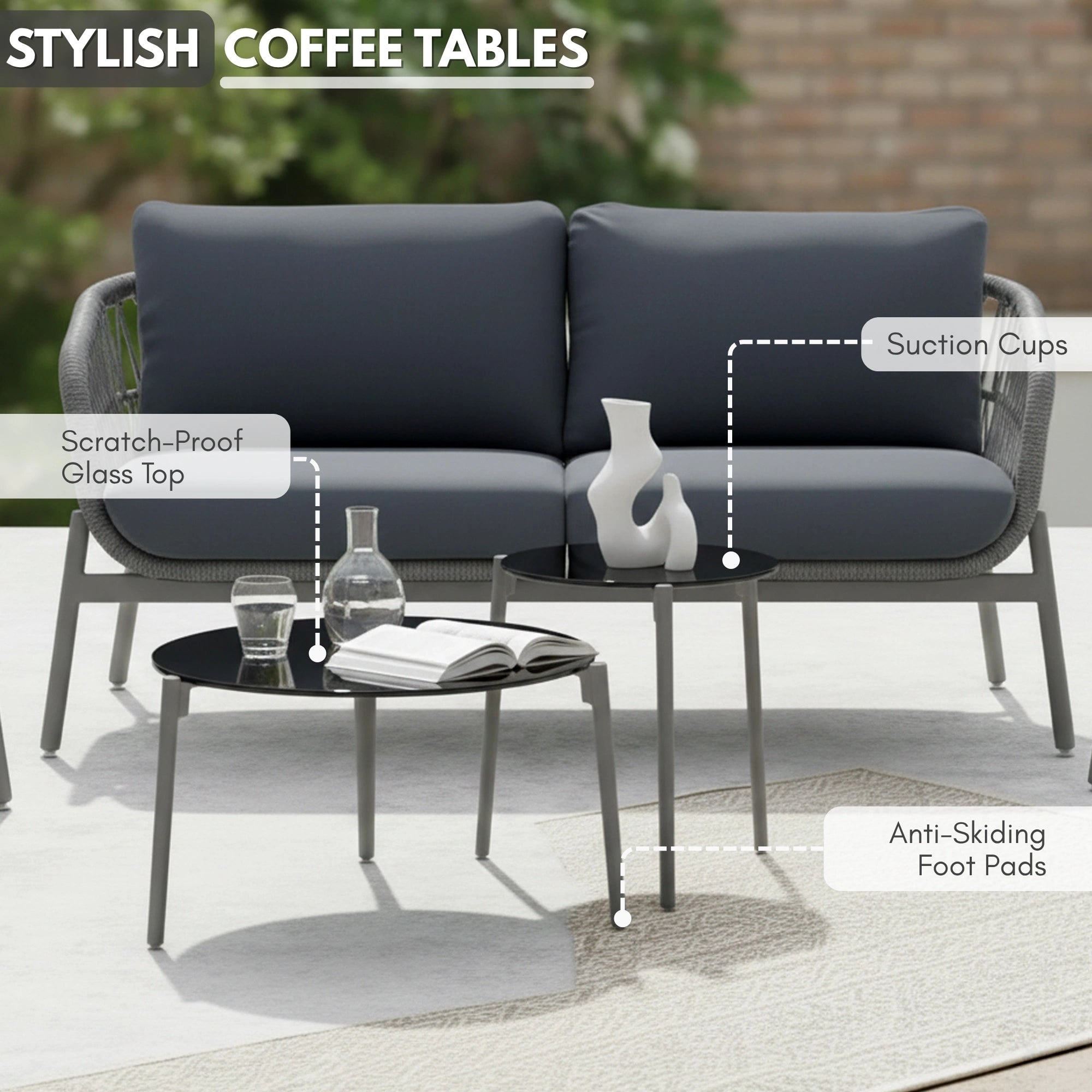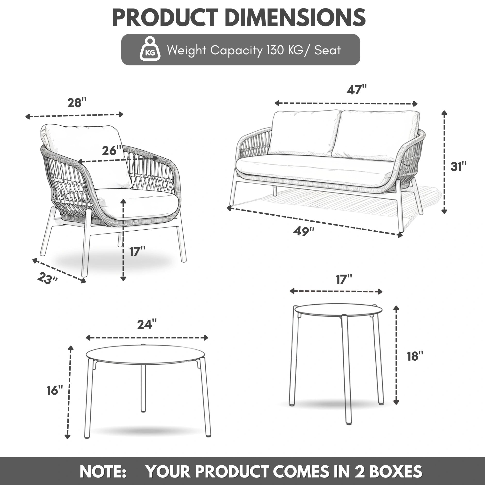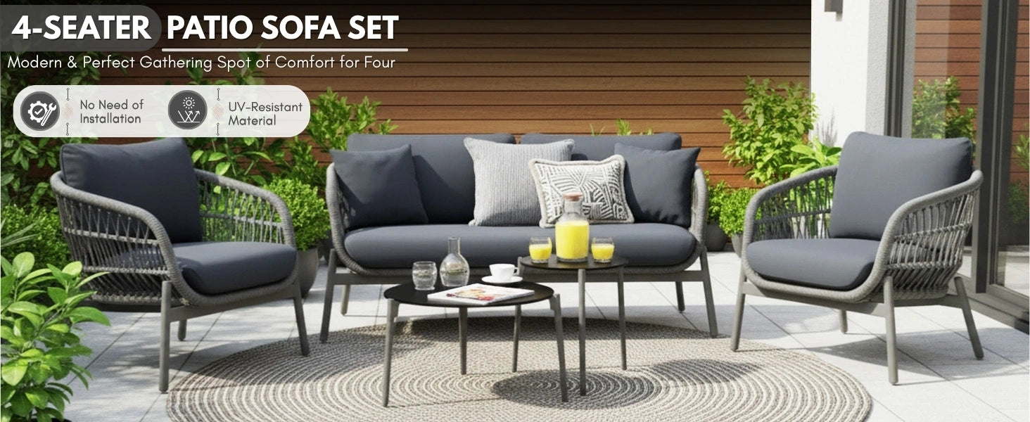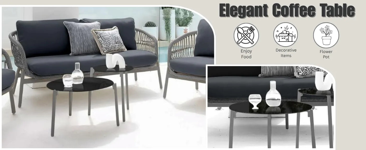 Transform your outdoor space into a serene retreat with this Outdoor 4-Seater Rope Sofa Conversation Set, a perfect blend of modern elegance and functional comfort. Designed for those who love to unwind, entertain, and enjoy nature, this premium set combines sleek aesthetics with durable materials to create a cozy oasis right in your garden, patio, or poolside. Crafted with a sturdy powder-coated metal frame and hand-woven weather-resistant rope, this conversation set is built to withstand sun, rain, and changing seasons without compromising on style. The ergonomic design of the sofa offers excellent lumbar support, while the soft, water-resistant cushions ensure cloud-like comfort for long hours of relaxation. Each cushion features removable, washable covers for easy maintenance, making it ideal for everyday outdoor use. At the heart of the set is a stylish round glass top center & side table both stable and elegant perfect for serving snacks, drinks, or displaying your favorite decor items during outdoor gatherings.