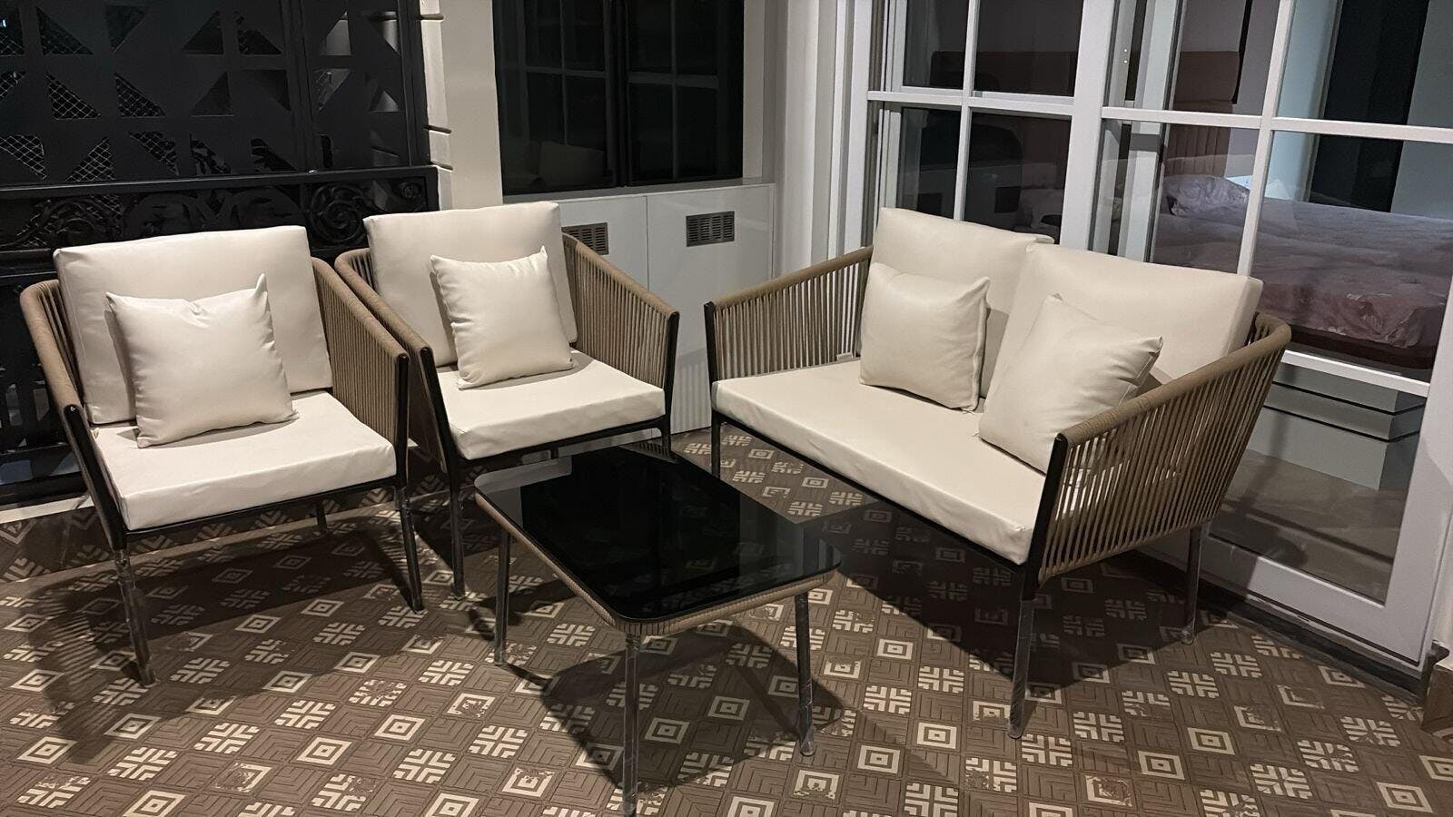 Crafted for comfort and built to last, this furniture set is the perfect blend of functionality and contemporary design, making it ideal for your garden, patio, balcony, or poolside. The sofa features premium handwoven rope detailing, supported by a sturdy, rust-resistant powder-coated metal frame that stands up to all weather conditions. The thick, soft all-weather cushions in off-white provide plush seating comfort and are equipped with washable covers for easy maintenance. Whether you're lounging on a lazy afternoon or hosting guests under the stars, the ergonomic backrest and wide seating ensure maximum relaxation. The set includes a sleek glass-top center table that adds a touch of sophistication while offering ample space for drinks, snacks, or décor. The glass surface is both stylish and easy to clean, making it perfect for everyday outdoor use.