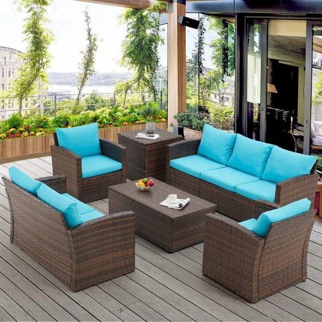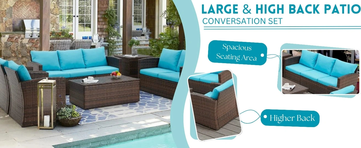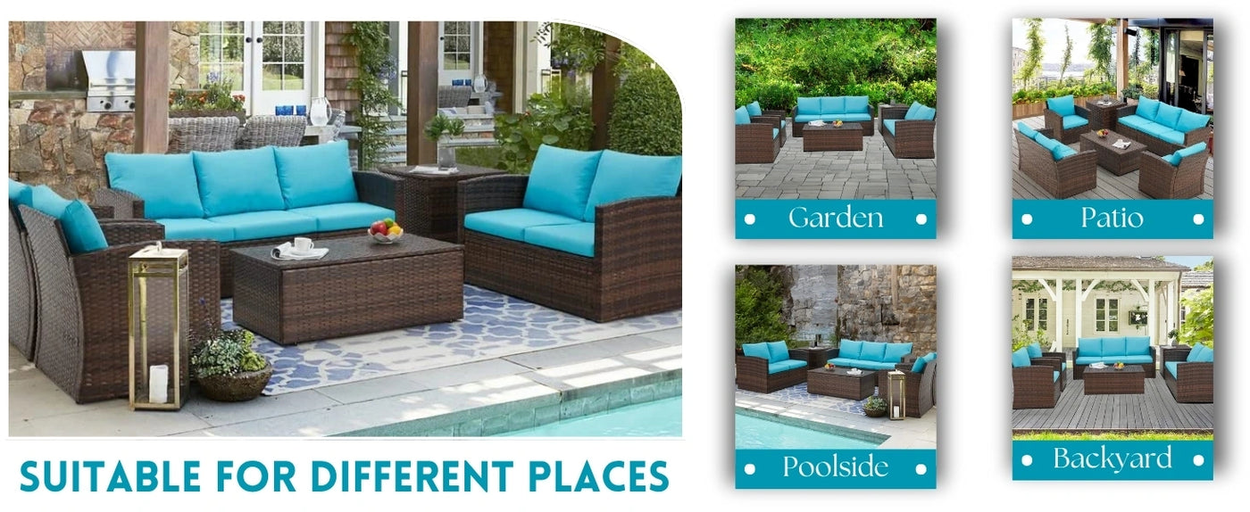 Transform your outdoor living space into a luxurious retreat with this Outdoor 7-Seater Wicker Sectional Sofa Set. Crafted with precision and designed for comfort, this weather proof patio furniture set in an elegant dark brown wicker finish with sky-blue cushions offers the perfect blend of style, durability, and versatility. Whether you're hosting a weekend garden party, enjoying evening tea on the balcony, or relaxing with your family indoors, this sofa set meets all your seating and lounging needs in one beautiful package. The plush, removable cushions are water-resistant and designed for maximum comfort, with soft padding and washable covers that make cleaning a breeze. The set also includes a wicker top center table and matching side table, giving you ample space to serve snacks, drinks, or hold décor items. Whether placed outdoors on patios, terraces, balconies, or indoors in sunrooms or living areas, this versatile furniture set enhances any space with its modern aesthetic and functional design.