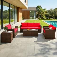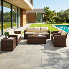 Transform your outdoor living space into a luxurious retreat with this Outdoor 7-Seater Wicker Sectional Sofa Set. Crafted with precision and designed for comfort, this weather proof patio furniture set in an elegant dark brown wicker finish with sky-blue cushions offers the perfect blend of style, durability, and versatility. Whether you're hosting a weekend garden party, enjoying evening tea on the balcony, or relaxing with your family indoors, this sofa set meets all your seating and lounging needs in one beautiful package. The plush, removable cushions are water-resistant and designed for maximum comfort, with soft padding and washable covers that make cleaning a breeze. The set also includes a wicker top center table and matching side table, giving you ample space to serve snacks, drinks, or hold décor items. Whether placed outdoors on patios, terraces, balconies, or indoors in sunrooms or living areas, this versatile furniture set enhances any space with its modern aesthetic and functional design.