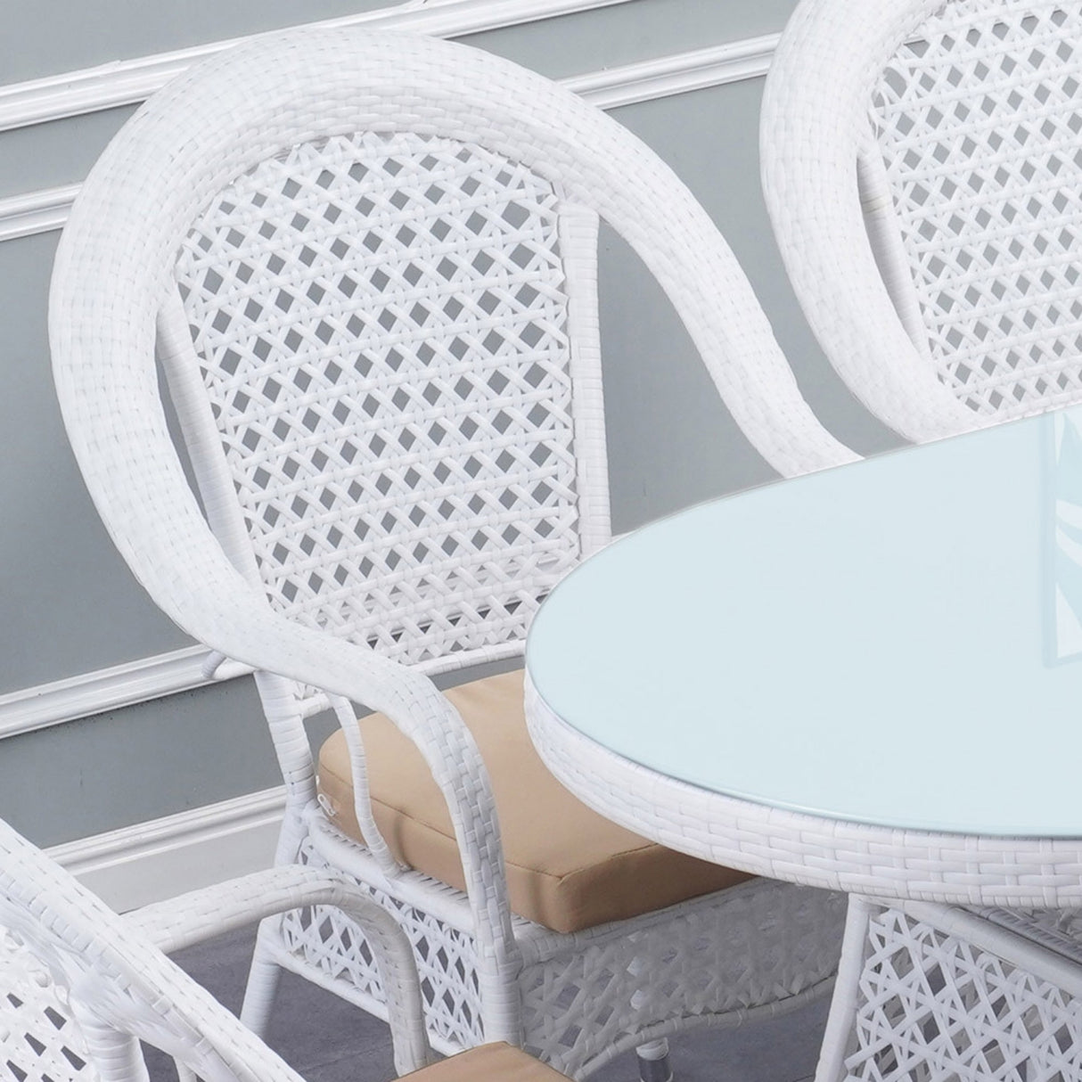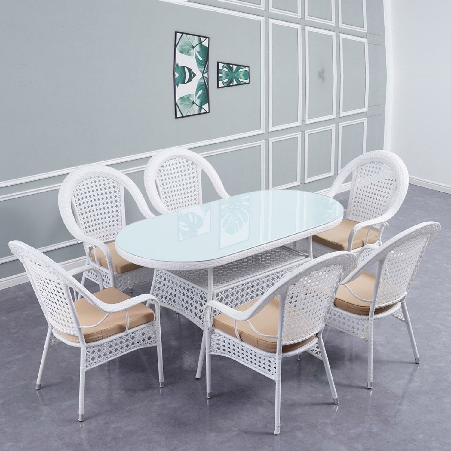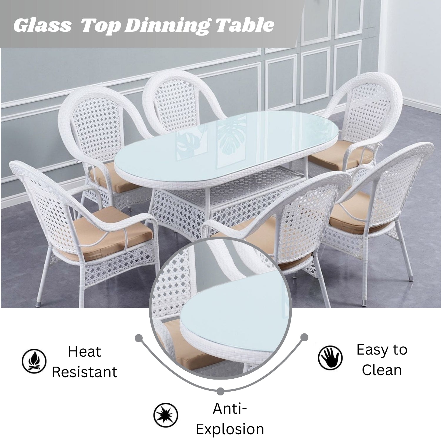 Elevate your patio, garden, or balcony with the Outdoor All-Weather Resistant Rattan Wicker 7-Piece Dining Set in White a perfect blend of durability, elegance, and everyday functionality. Crafted with premium handwoven rattan wicker and a rust-resistant powder-coated metal frame, this dining set is built to withstand all weather conditions be it rain, sun, or humidity making it ideal for year-round outdoor use. This stylish set includes one spacious dining table with a smooth, tabletop for easy cleaning and four ergonomically designed chairs that deliver lasting comfort. Whether you're enjoying a quiet morning coffee or hosting a weekend brunch, this set offers a welcoming spot for every occasion. Designed to suit modern lifestyles, its compact footprint fits comfortably in smaller spaces without compromising style. The rich white finish adds a sophisticated touch to any setting, while the removable cushion covers make cleaning a breeze leaving you with more time to relax and enjoy.