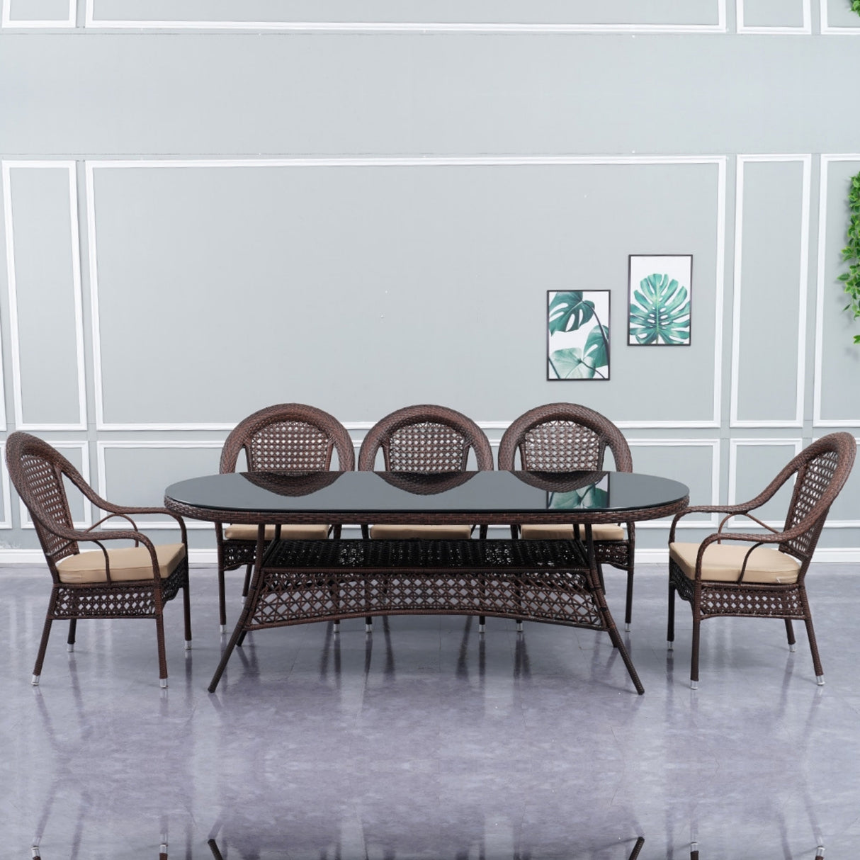 Elevate your patio, garden, or balcony with the Outdoor All-Weather Resistant Rattan Wicker 7-Piece Dining Set in White a perfect blend of durability, elegance, and everyday functionality. Crafted with premium handwoven rattan wicker and a rust-resistant powder-coated metal frame, this dining set is built to withstand all weather conditions be it rain, sun, or humidity making it ideal for year-round outdoor use. This stylish set includes one spacious dining table with a smooth, tabletop for easy cleaning and six ergonomically designed chairs that deliver lasting comfort. Whether you're enjoying a quiet morning coffee or hosting a weekend brunch, this set offers a welcoming spot for every occasion. Designed to suit modern lifestyles, its compact footprint fits comfortably in smaller spaces without compromising style. The rich dark brown finish adds a sophisticated touch to any setting, while the removable cushion covers make cleaning a breeze leaving you with more time to relax and enjoy.
