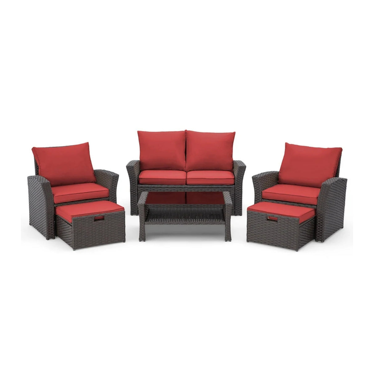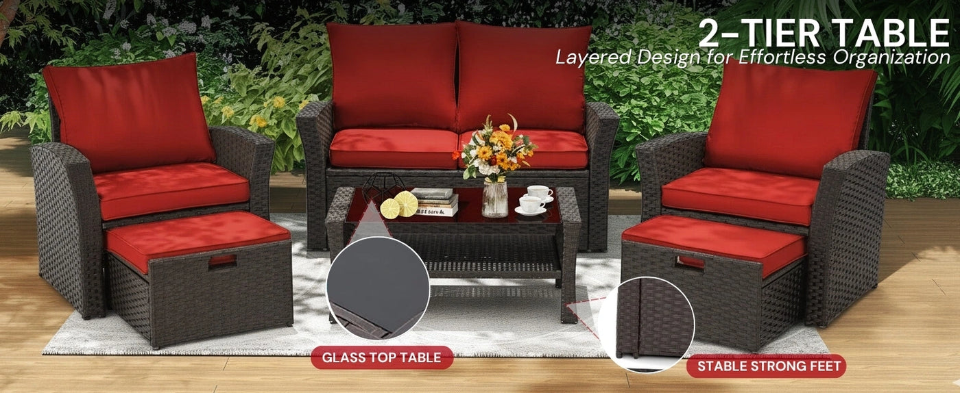 • Complete 6-Piece Set : Includes 1 loveseat, 2 single chairs, 2 ottomans, and 2-tier glass-top tables for a balanced mix of comfort and convenience.