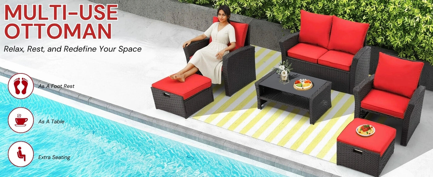 • Dual-Purpose Ottomans : Use as footrests for lounging or as extra seating for guests.