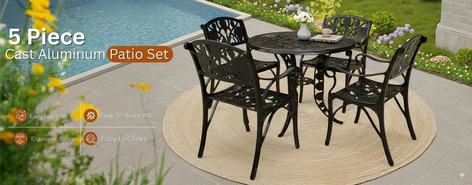 The Aluminium Outdoor 5-Piece Patio Bistro Set is a perfect blend of style, strength, and comfort, designed to elevate any outdoor space. Crafted from high-quality cast aluminium, this set is built to withstand diverse weather conditions, ensuring long-lasting durability without rusting, fading, or warping. Its timeless design, paired with a smooth powder-coated finish, provides a sophisticated look that complements gardens, balconies, terraces, poolside areas, or patios. The set includes four ergonomically designed chairs and a spacious round table, featuring a central umbrella hole for shade options, making it versatile for both sunny and breezy days. The lightweight yet sturdy aluminium frame makes it easy to move, while the elegant lattice and floral pattern details enhance its decorative appeal. Comfort is prioritized with gently curved backrests and wide seating, allowing you to relax for hours while dining, sipping tea, or enjoying conversations. Low maintenance and scratch-resistant, this bistro set promises both functionality and aesthetic charm, making it a valuable addition to any outdoor setting.