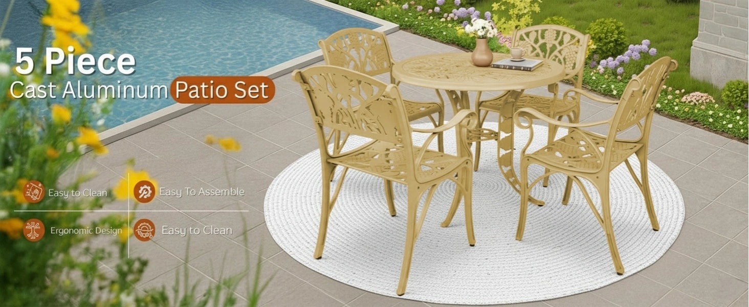 The Aluminium Outdoor 5-Piece Patio Bistro Set is a perfect blend of style, strength, and comfort, designed to elevate any outdoor space. Crafted from high-quality cast aluminium, this set is built to withstand diverse weather conditions, ensuring long-lasting durability without rusting, fading, or warping. Its timeless design, paired with a smooth powder-coated finish, provides a sophisticated look that complements gardens, balconies, terraces, poolside areas, or patios. The set includes four ergonomically designed chairs and a spacious round table, featuring a central umbrella hole for shade options, making it versatile for both sunny and breezy days. The lightweight yet sturdy aluminium frame makes it easy to move, while the elegant lattice and floral pattern details enhance its decorative appeal. Comfort is prioritized with gently curved backrests and wide seating, allowing you to relax for hours while dining, sipping tea, or enjoying conversations. Low maintenance and scratch-resistant, this bistro set promises both functionality and aesthetic charm, making it a valuable addition to any outdoor setting.