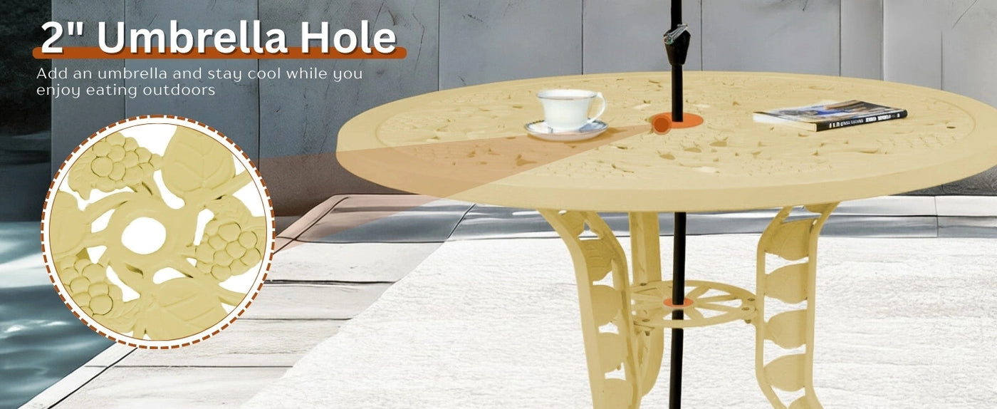 - Functional & Versatile Table : Round table with a central umbrella hole, accommodating 9ft–10ft umbrellas for shade.