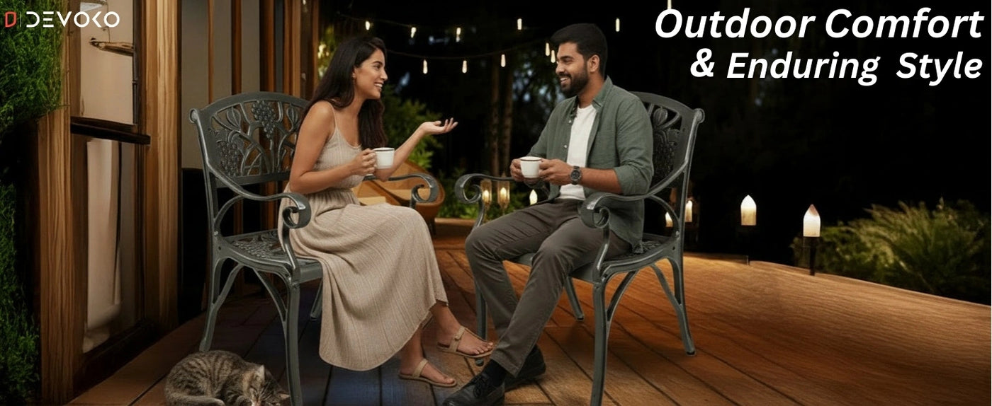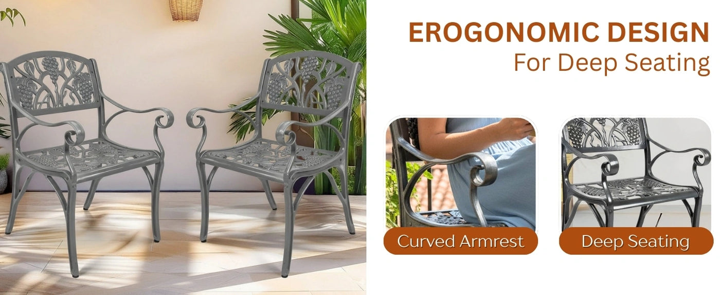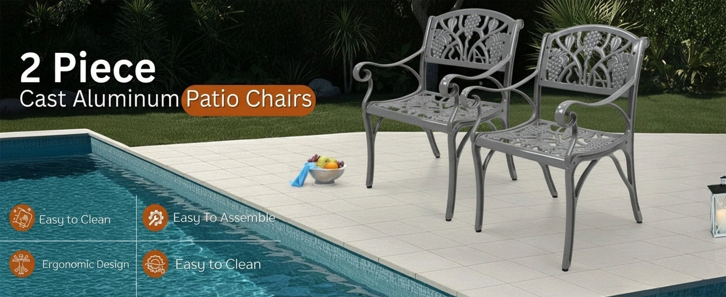 Bring charm and elegance to your outdoor space with this Outdoor Cast Aluminium 2-Piece Patio Set, featuring two beautifully designed chairs. Built with premium cast aluminium, this set offers the perfect combination of strength, durability, and lightweight versatility. The rustproof and weather-resistant finish ensures lasting performance, even in outdoor conditions, making it ideal for use in gardens, balconies, patios, or by the poolside. The chairs feature intricate floral-inspired detailing and a classic powder-coated finish that blends well with both traditional and modern outdoor décor. With ergonomically curved backrests and spacious seating, this set is designed for comfort during morning coffee, evening relaxation, or casual conversations outdoors. Easy to clean and maintain, the 2-piece patio set is not only stylish but also highly practical for everyday outdoor use. Whether for a cozy balcony setup or a decorative addition to a larger patio, this cast aluminium chair set offers durability, beauty, and functionality in one timeless package.