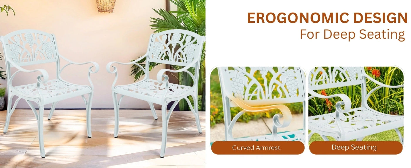 Upgrade your outdoor seating experience with these premium Cast Aluminum Chairs, designed to combine timeless elegance with all-weather durability. Crafted from high-quality cast aluminum with a rust- and corrosion-resistant finish, these chairs are built to withstand sun, rain, and humid conditions without losing their strength or beauty. Perfect for outdoor dining, casual lounging, or entertaining guests, these chairs are low-maintenance and easy to clean with just a damp cloth. Their elegant curves and smooth edges ensure safety while adding a touch of sophistication to any outdoor space.