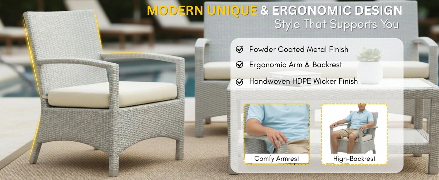 - Waterproof & Removable Cushions : Thick, high-density foam cushions provide plush seating comfort. Covered in water resistant fabric with removable and washable covers for easy maintenance and year-round use. Elegant cushions and sleek wicker styling make this set equally at home in a modern indoor lounge or a cozy outdoor garden, terrace, or poolside setup.
