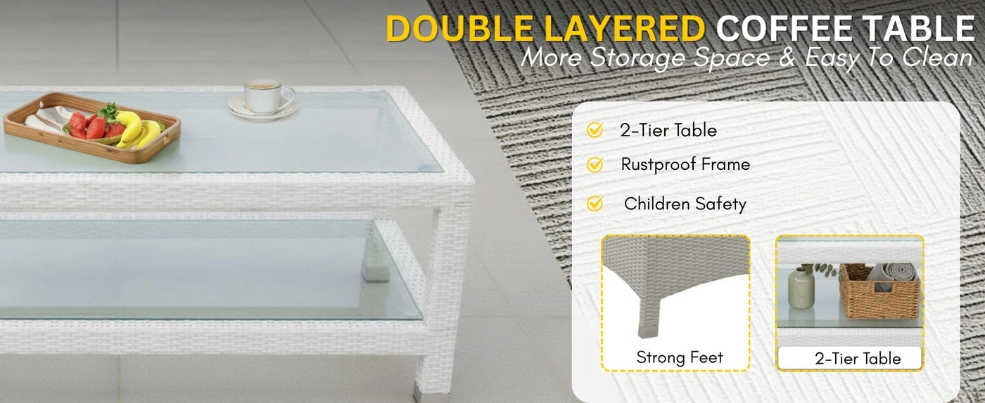 - Multi-Functional Center & Side Tables : Includes a stylish 2-tier glass-top center table and a convenient side table perfect for serving snacks, drinks, or decorative accents whether on a balcony, patio, or living room.