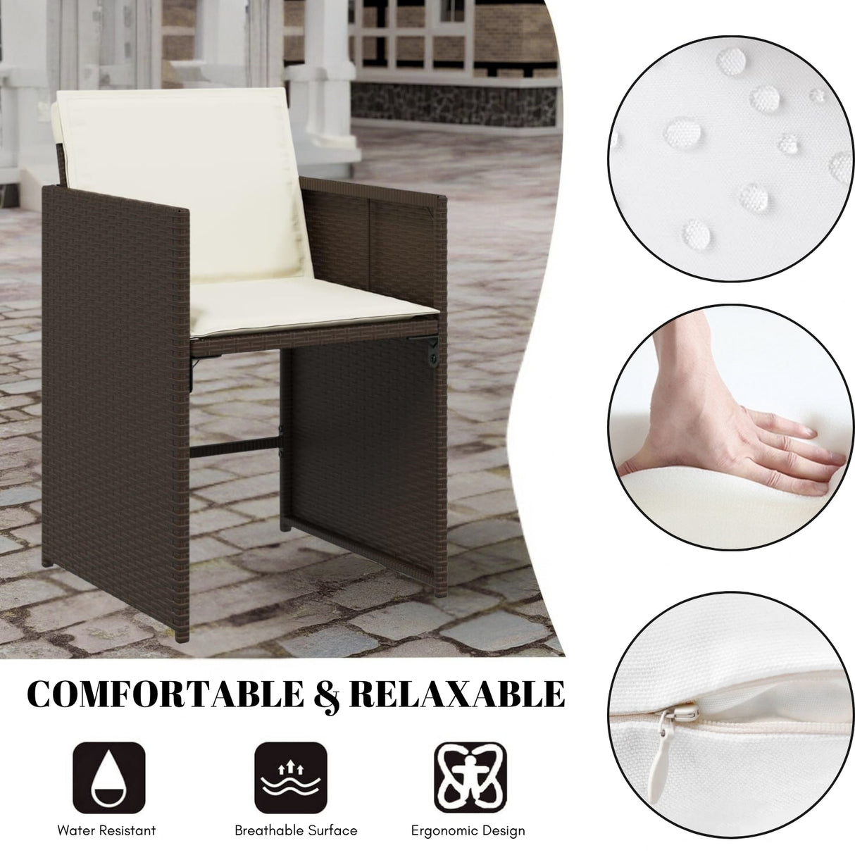 - Comfortable Cushioned Seating : Features 8 ergonomic chairs with soft, thick seat cushions covered in water-resistant fabric with zippers for easy removal and cleaning.