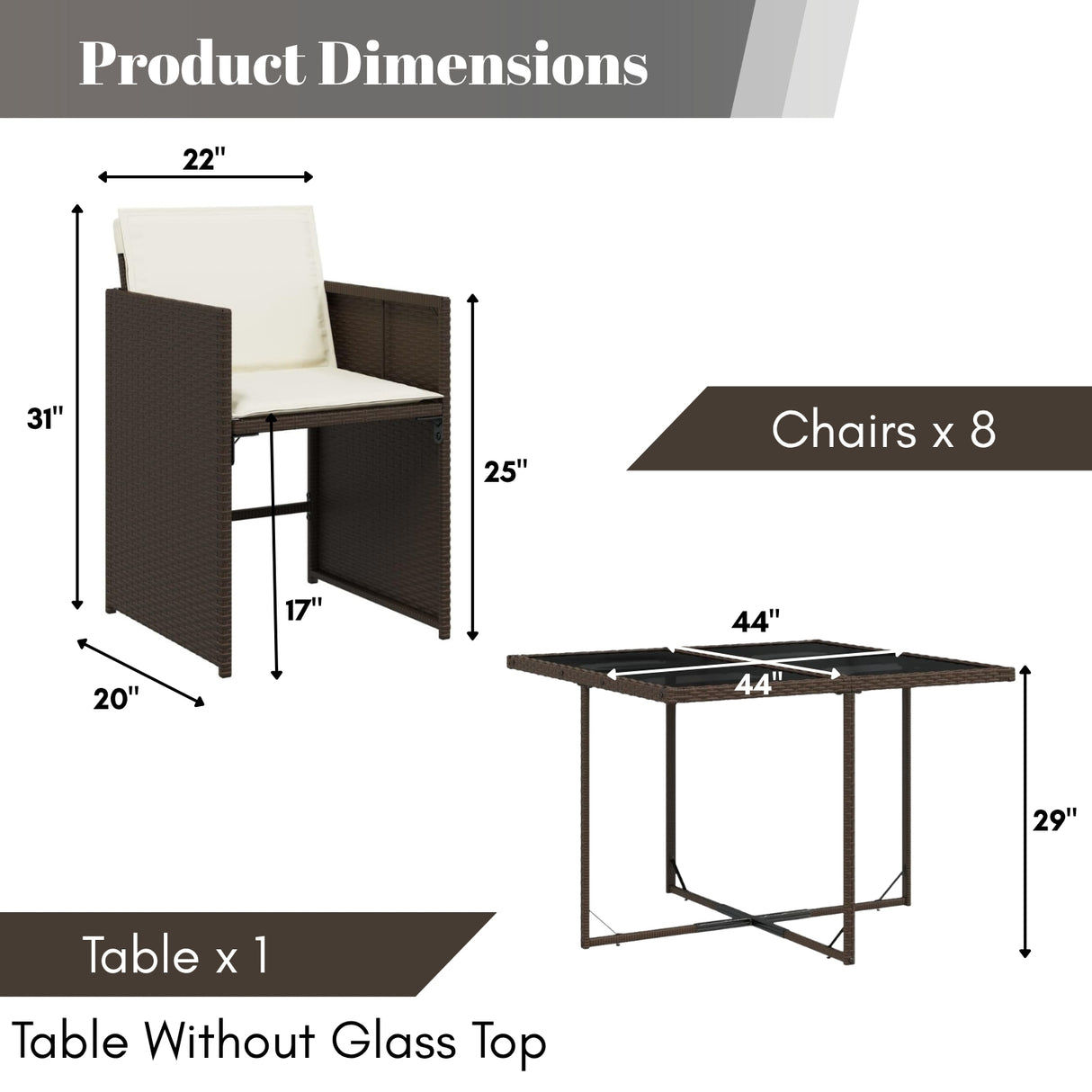 - 8 Chair Dimension: 22″Lx20″Wx31″H