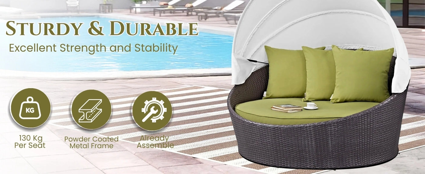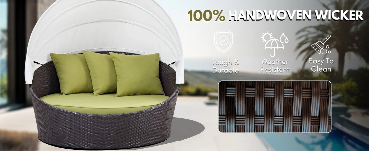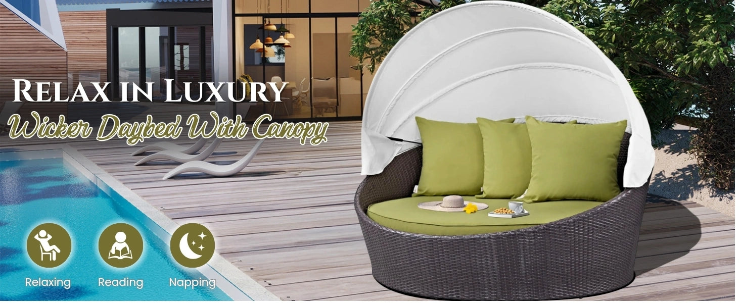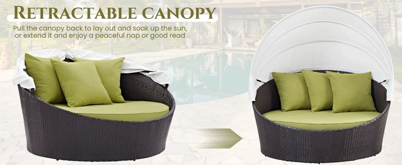 Transform your outdoor space into a luxurious retreat with this Outdoor Rattan Wicker Patio Daybed with Canopy. Crafted from durable, weather-resistant rattan and supported by a rustproof powder-coated metal frame, this stylish daybed is built to withstand sun, rain, and daily wear perfect for year-round use in your poolside, garden, deck, or lawn. Designed for comfort and relaxation, it features thick, high-density cushions with removable, washable covers for easy maintenance. The retractable canopy provides adjustable shade and UV protection, allowing you to relax in comfort whether you're soaking up the sun or enjoying a shaded nap. With its elegant curved design and spacious seating, this daybed offers a resort-like experience at home. Ideal for lounging, reading, or entertaining guests outdoors, it’s the ultimate blend of functionality and style.